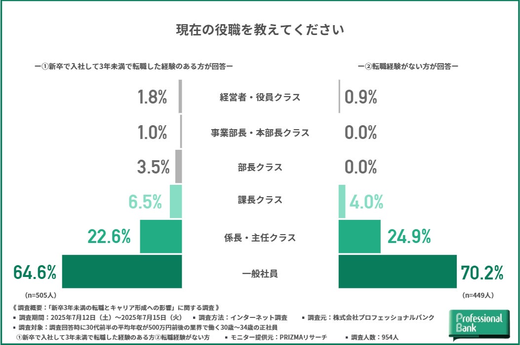 一方、転職経験がない方では『一般社員(70.2%)』が最も多く、『係長・主任クラス(24.9%)』『課長クラス(4.0%)』と続きました。