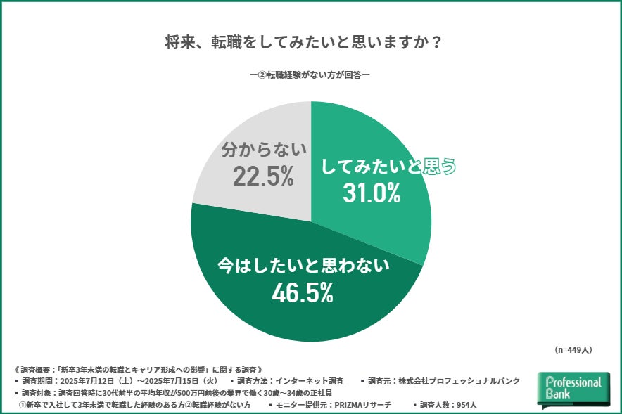 また、“転職経験がない方”に「将来、転職をしてみたいと思いますか?」と尋ねたところ、約半数の方が『今はしたいと思わない(46.5%)』と回答しました。