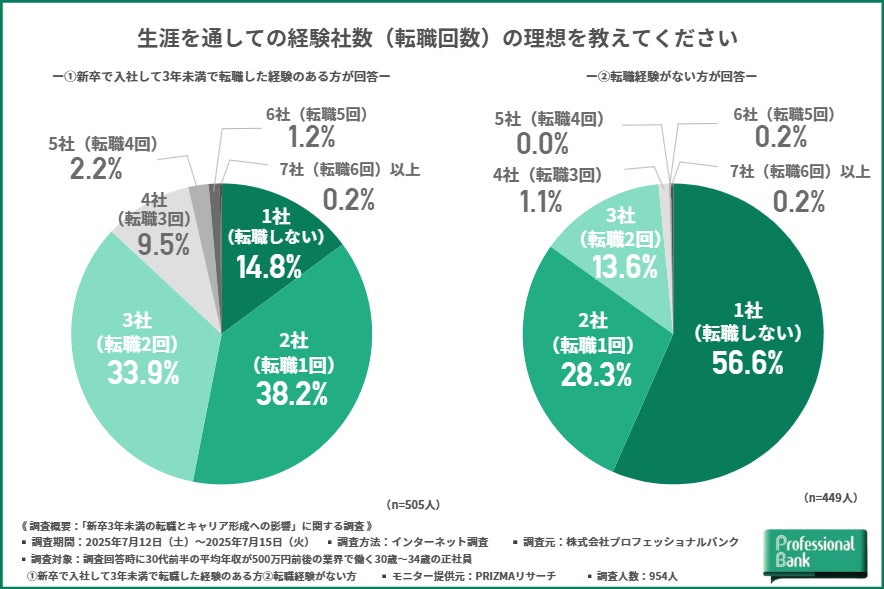 全対象者に対して、「生涯を通しての経験社数(*転職回数)の理想」について尋ねたところ、以下の回答結果になりました。