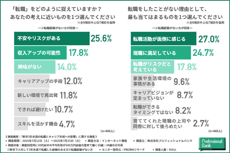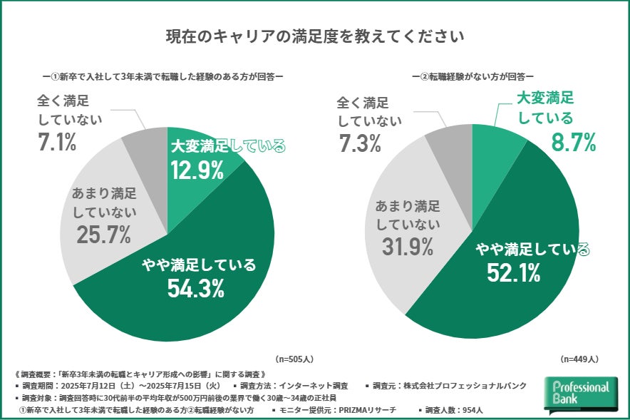 今回の調査では、「新卒入社から3年未満で転職した経験のある方」と「転職経験のない方」を比較することで、転職に対する“異なる意識”と“共通するキャリア観”が見えてきました。
