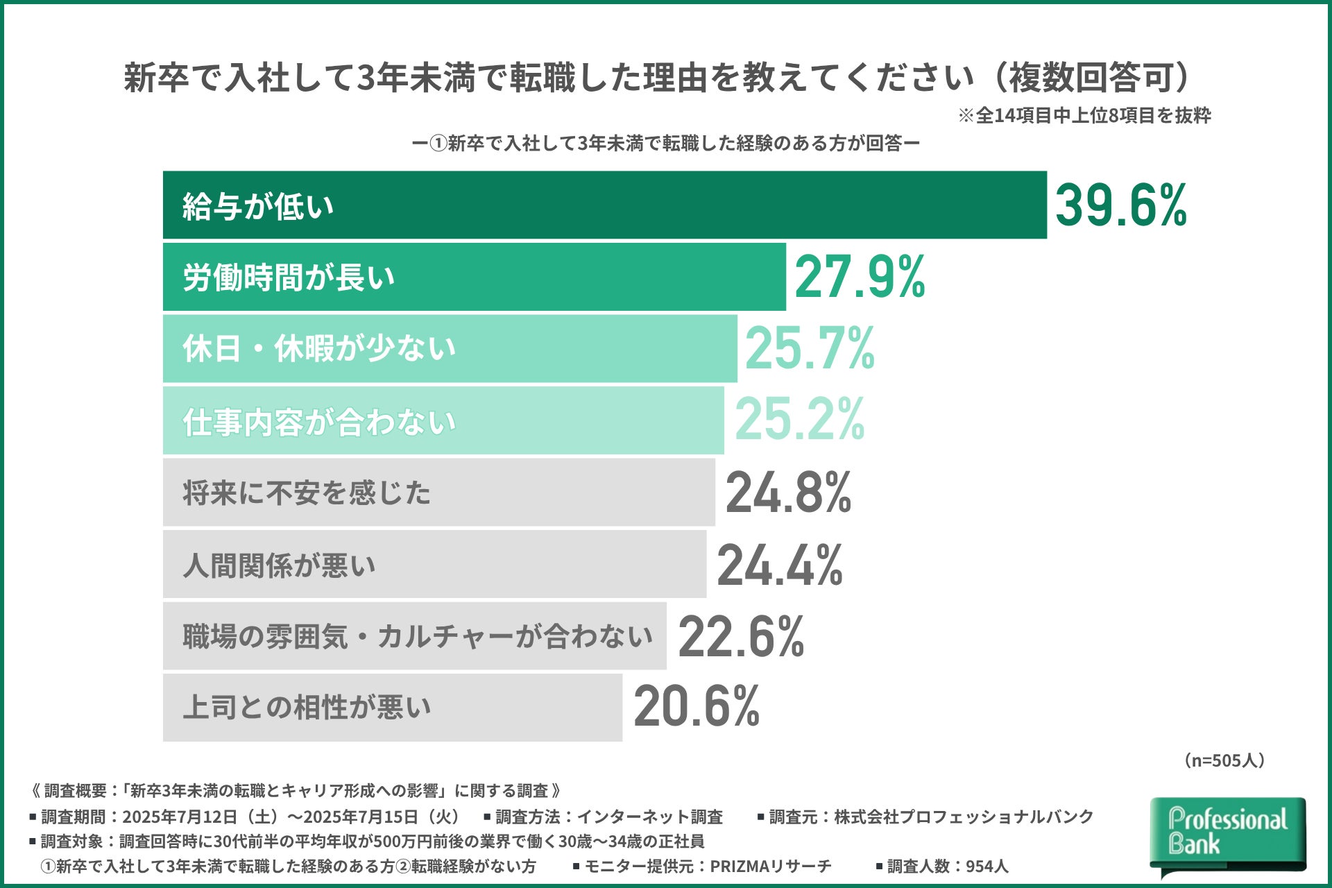 ①新卒で入社して3年未満で転職した経験のある方:505名