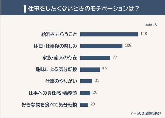 仕事をしたくないときのモチベーションを聞いたところ、1位は「給料をもらうこと(148人)」でした。2位「休日・仕事後の楽しみ(108人)」、3位「家族・恋人の存在(77人)」、4位「趣味による気分転換(50人)」が続きます。