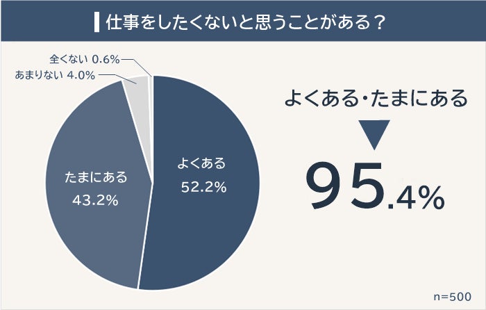 お仕事をしている500人に「仕事をしたくないと思うことがあるか」を聞いたところ、「よくある」「たまにある」が合わせて95.4%にのぼりました。ほとんどの人に「仕事をしたくない」「仕事に行きたくない」と感じた経験があるようです。