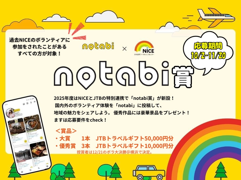 2025年度は特別に「notabi賞」が設定されます。「notabi賞」では、過去の参加者も含むNICEでのボランティア活動参加者から、活動を通じて発見した地域の魅力を「notabi」上で応募していただき、受賞者が決定します。