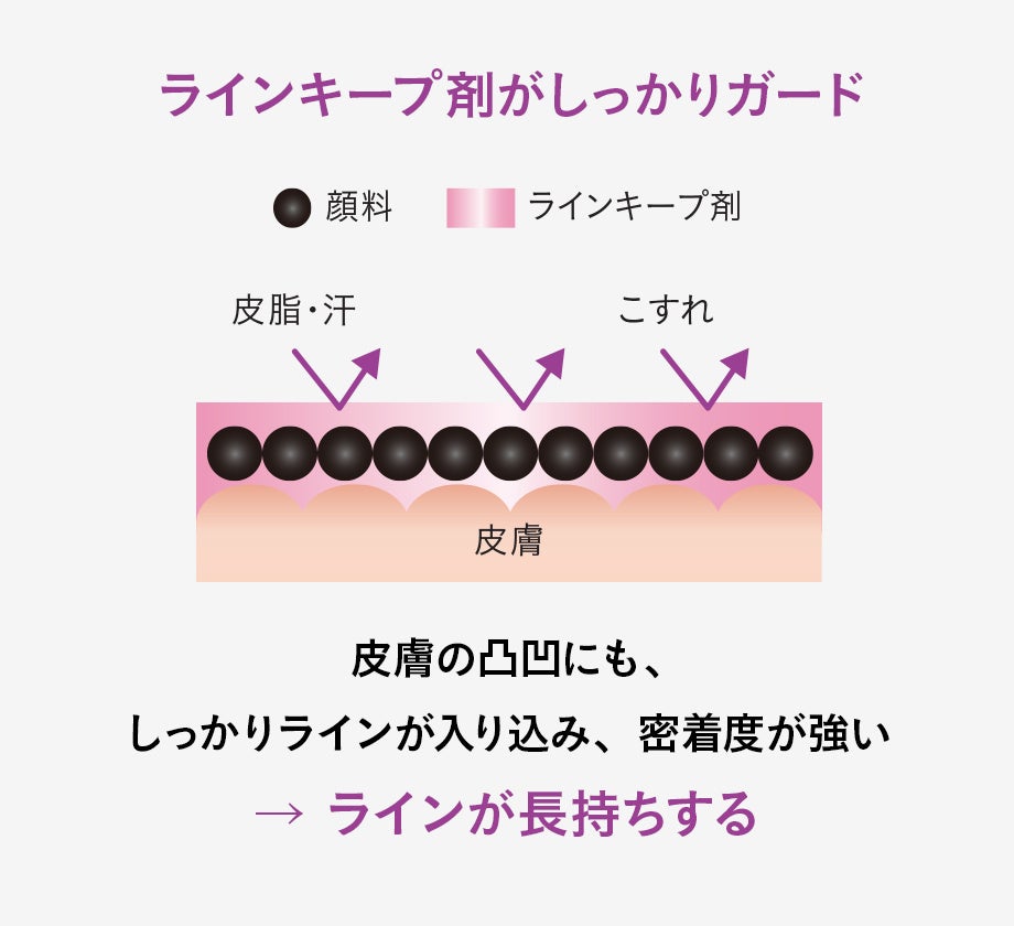 もちのよさの秘密は、高配合されたラインキープ剤がはっ水効果のあるフィルムを形成するため。皮脂・汗・涙をはじき、まばたきなどによるこすれにも強いため、ラインのにじみや薄れを防ぎます。描いてすぐにまばたきをしても、ラインがにじみにくい速乾タイプ。