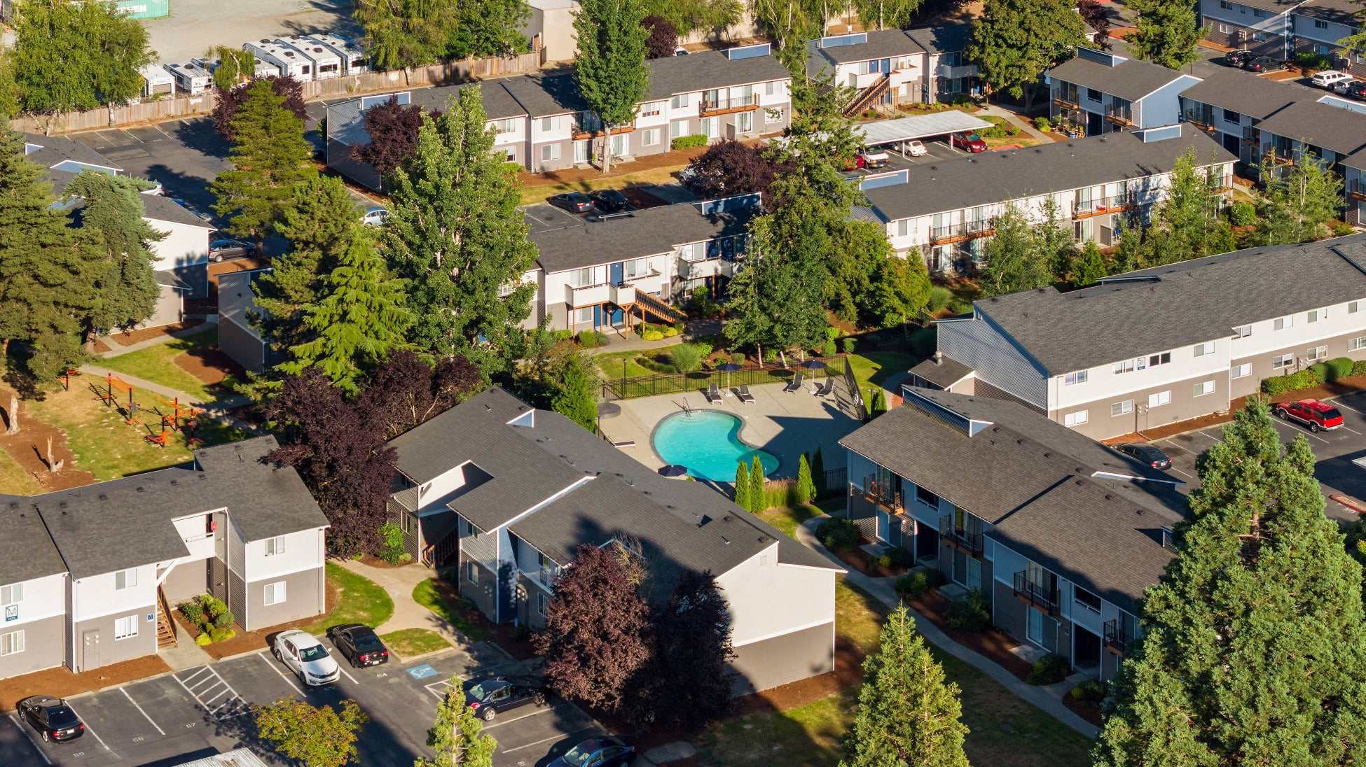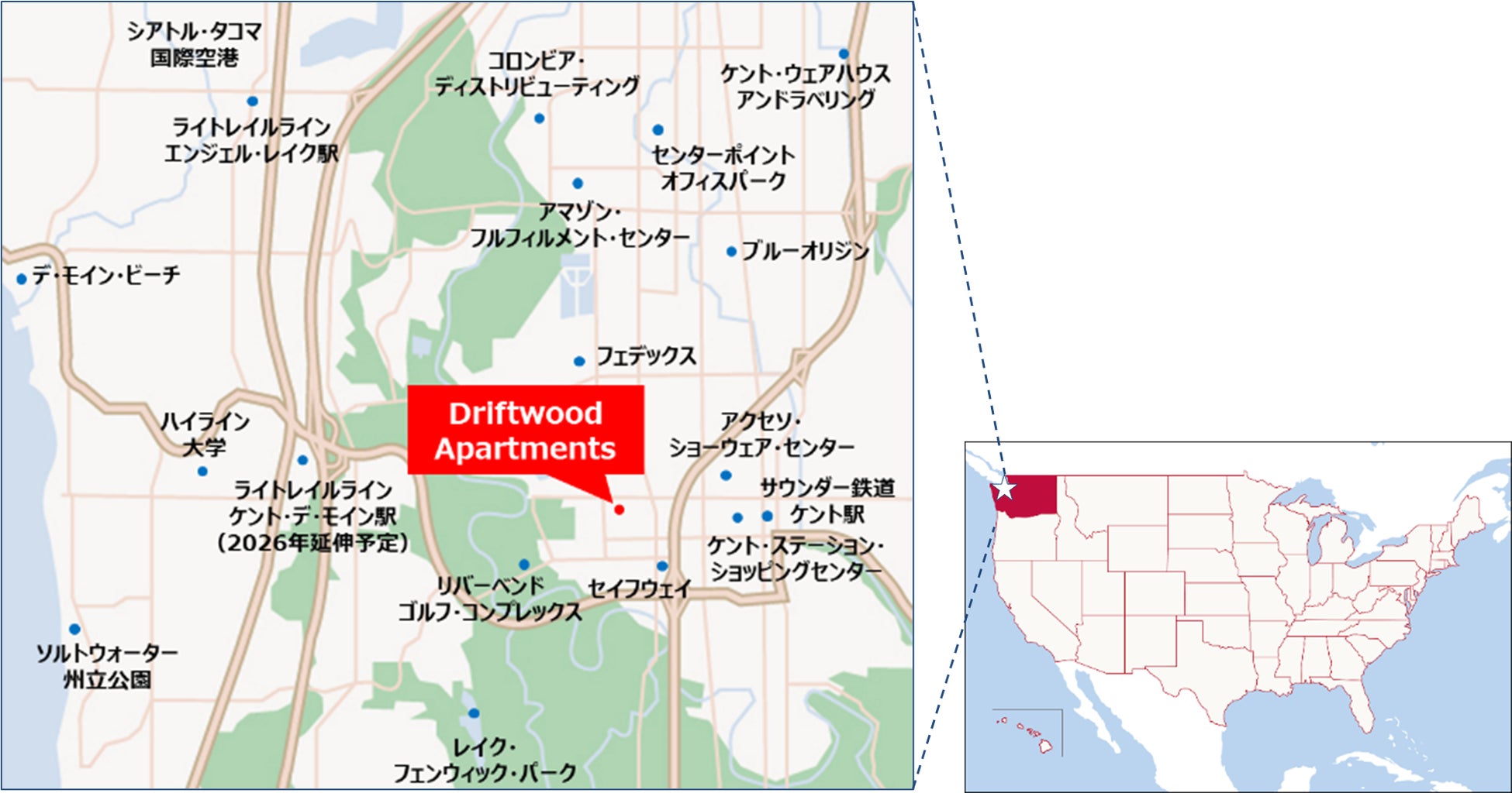 今般、当社が取得した海外不動産は、ワシントン州の経済都市シアトルから車で約25分、シアトル・タコマ国際空港からは車で約15分の場所に所在する、34棟382室から構成される大規模集合住宅です。