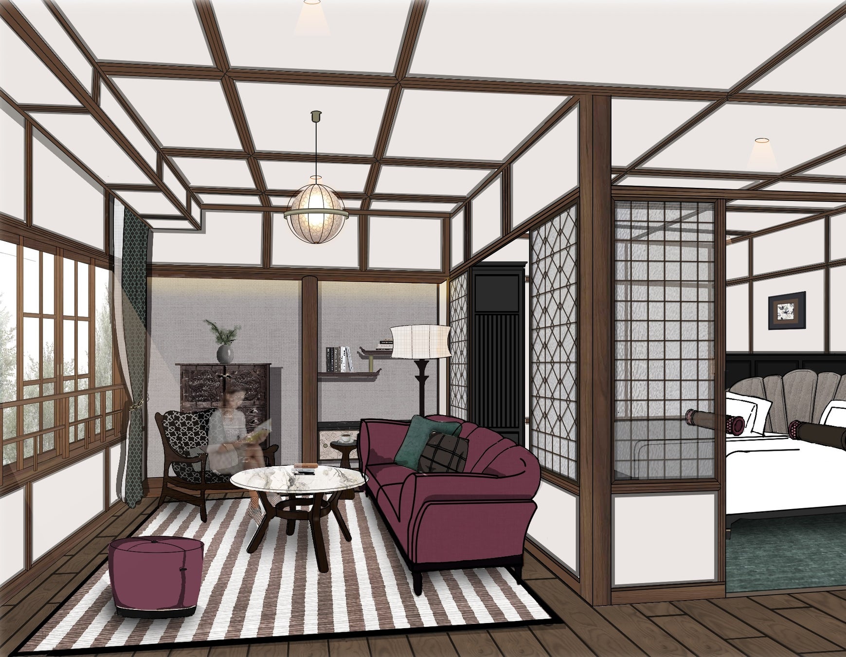 丸く温かみのあるペンダント照明をはじめ、ガラス障子、猫足バスタブ、この地を代表する伝統工芸品の軽井沢彫家具など、万平ホテルに受け継がれる「和洋折衷」をコンセプトにリニューアル。秘められた万平ホテルの歴史を感じるご滞在をお楽しみいただけます。