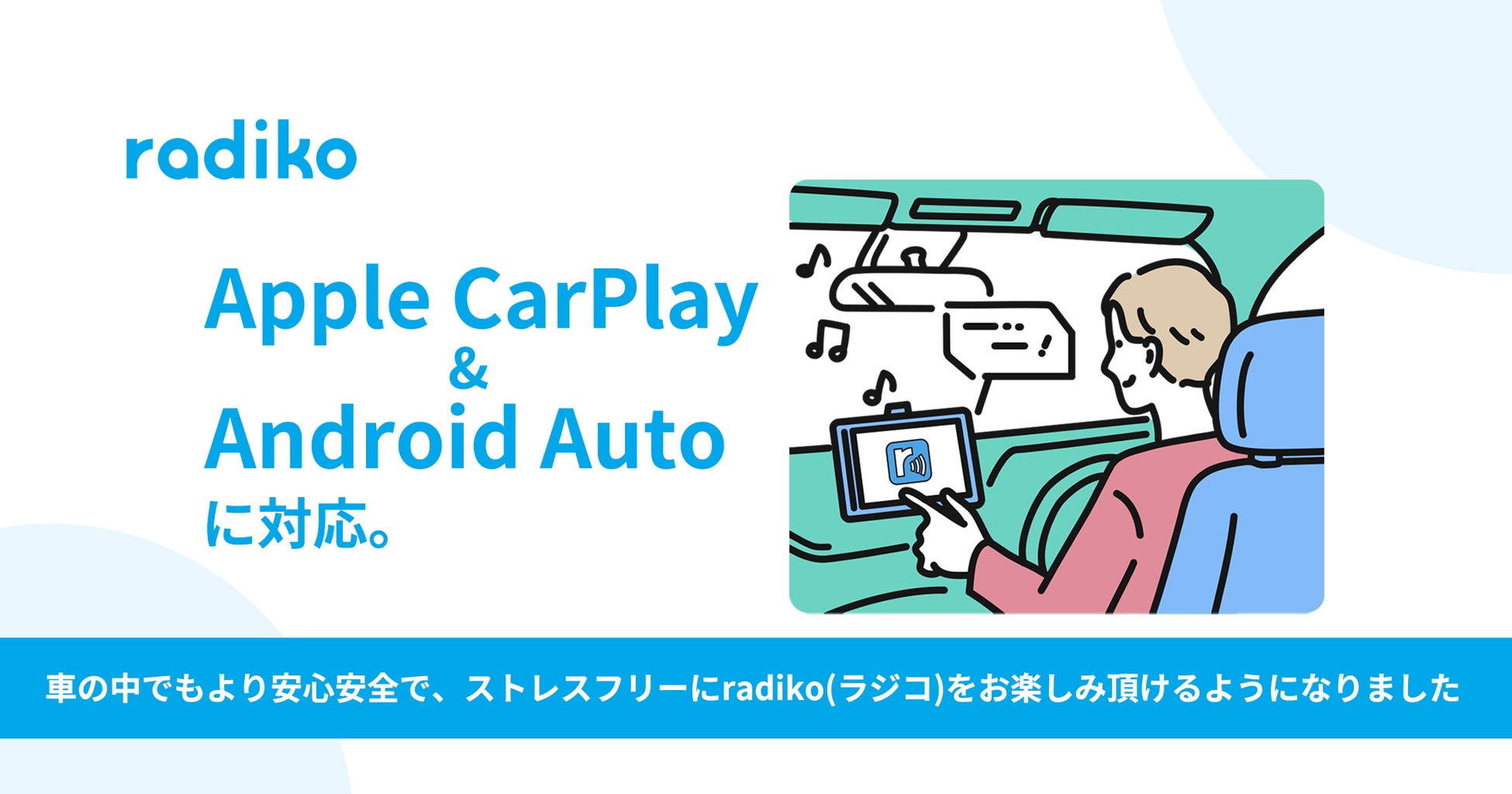 株式会社radiko(代表取締役社長:池田 卓生、所在地:東京都港区)は、車の中でもより安心安全に、またストレスフリーでradiko(ラジコ)をお楽しみ頂けるよう「Apple CarPlay・Android Auto」に対応いたしました。