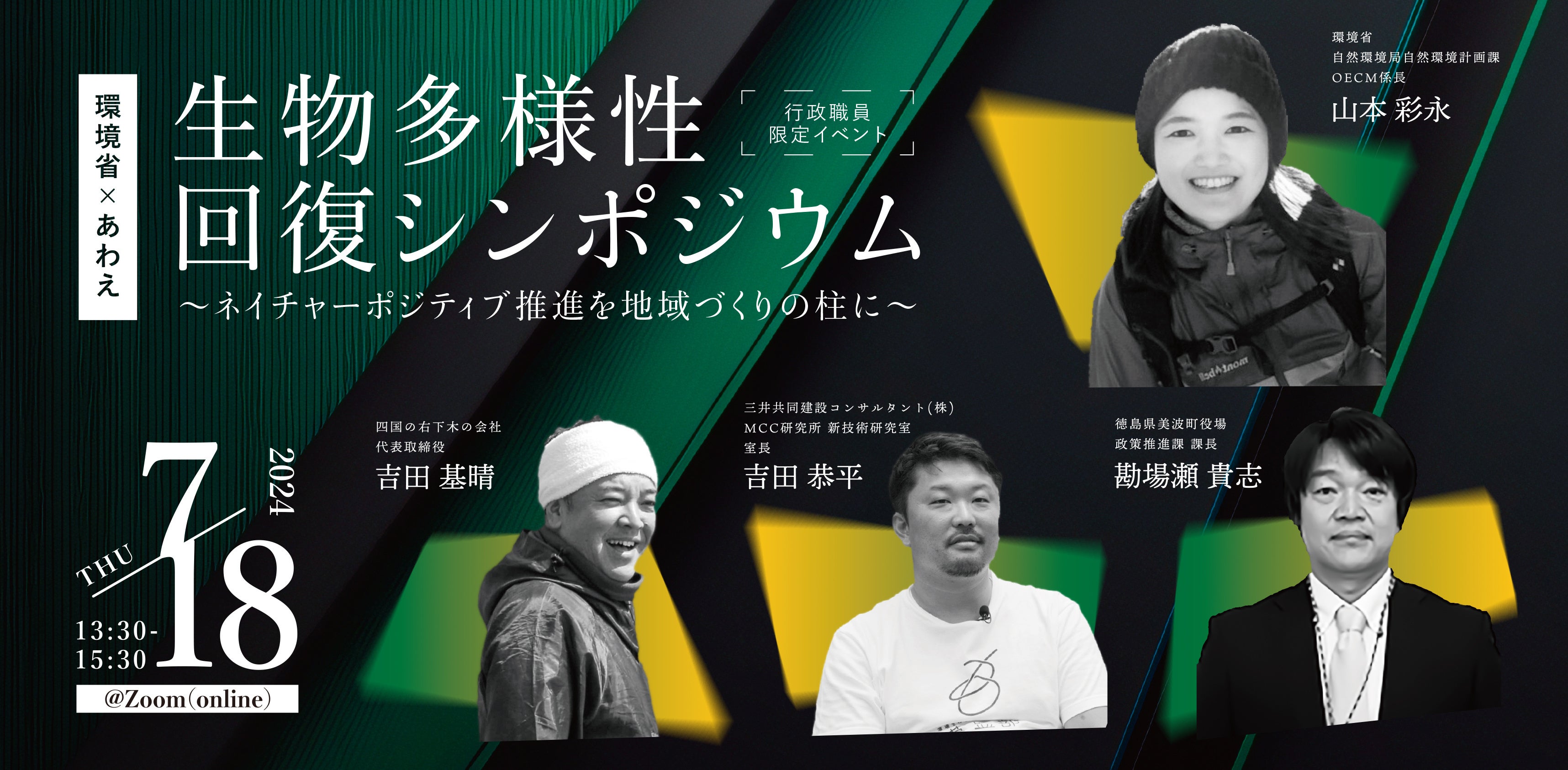 本イベントは、「ネイチャーポジティブ」の推進に向けたあわえ初の自治体職員限定のシンポジウムです。国の政策の動きや自治体と民間企業がどのように連携し、ネイチャーポジティブに向けた取り組みを進めているかの具体事例を紹介いたします。ネイチャーポジティブの機運、国の政策を自治体としてどのように捉え、地域づくりにも活用していくのかを皆さんと一緒に考えます。