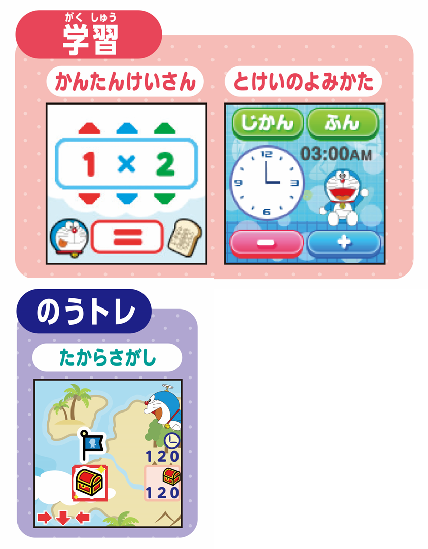 さらに、イン・アウト2個のカメラに加えマイク機能も付いているので、動画撮影や声の録音も可能です。カメラ使ってひみつ道具を見つけるゲームなど、29個のアプリが入っており、ドラえもんの世界観をお楽しみいただけます。また、計算や時計の読み方などの学習機能、歩数計やてくてく散歩、ダンスなど身体を動かすあそびが楽しめるアプリも充実しています。