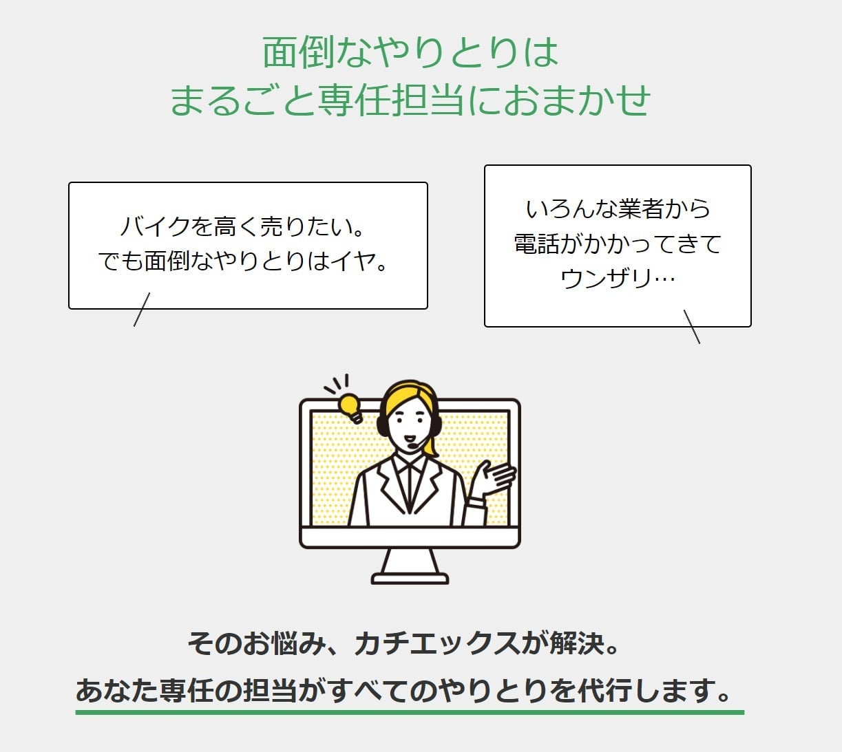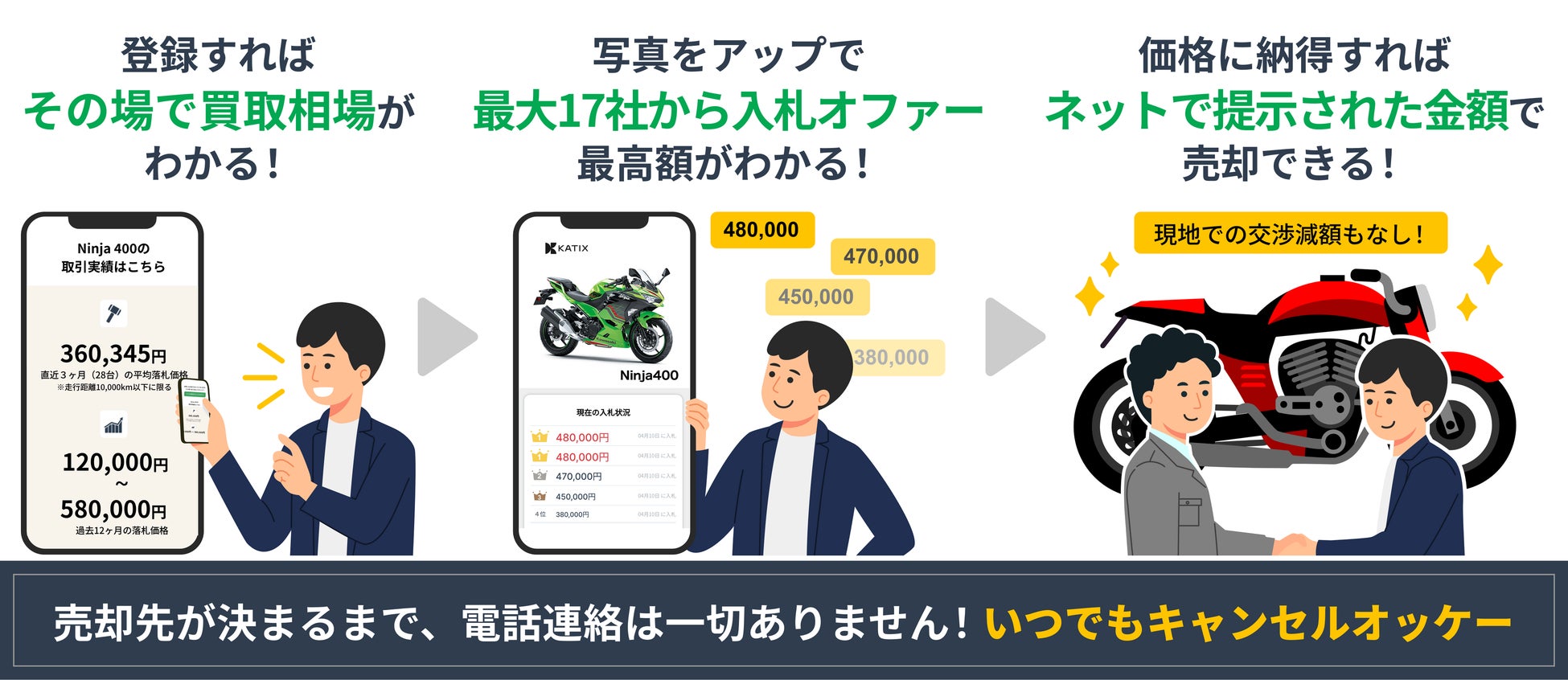 カチエックスとは、バイクの写真を送るだけで全国最大17社に一括査定できる「ネット完結のバイク一括査定サービス」です。