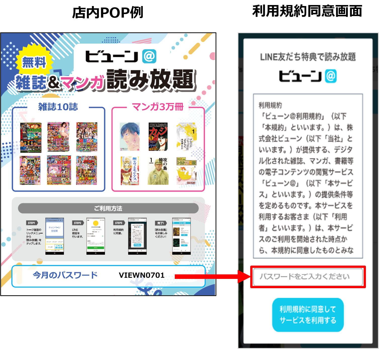 そのため、店内ポップなどに毎月のパスワードを提示することで定期的に更新される雑誌を見たいお客様がビューン@を利用するためにお店に来ていただくことができるため、来店促進としてもご利用いただけます。