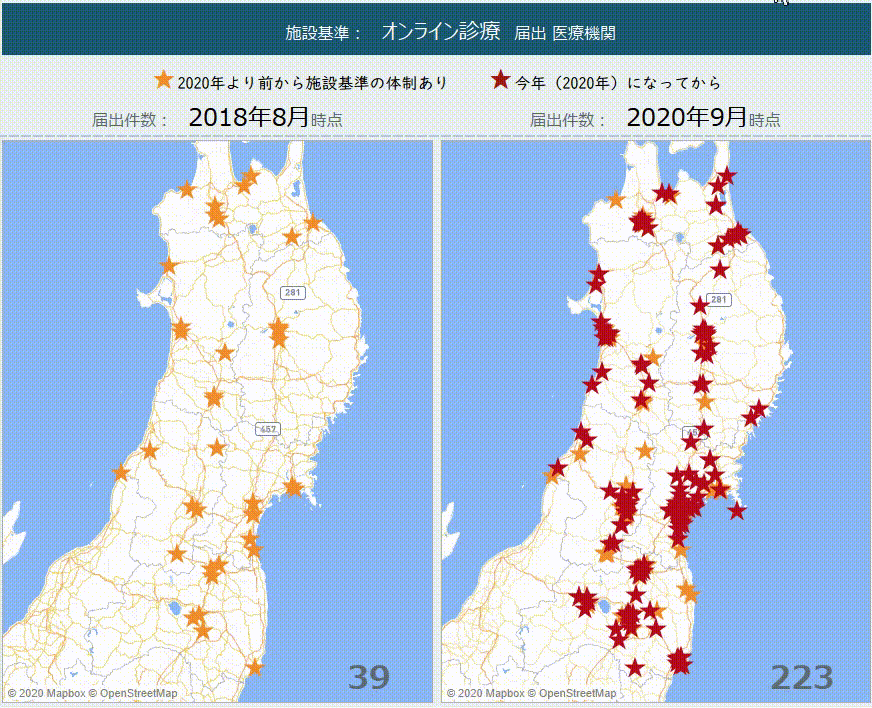 糖尿病透析予防指導の体制があり、オンライン診療体制がある医療機関(各地方厚生局公開データ)は、2018年8月時点では 全国で40施設。2020年9月時点だと189施設に増えていたようです。オンライン診療に対応している医療機関は、今年に入って都市部から少しずつ周辺地域へも広がりつつあるようです。