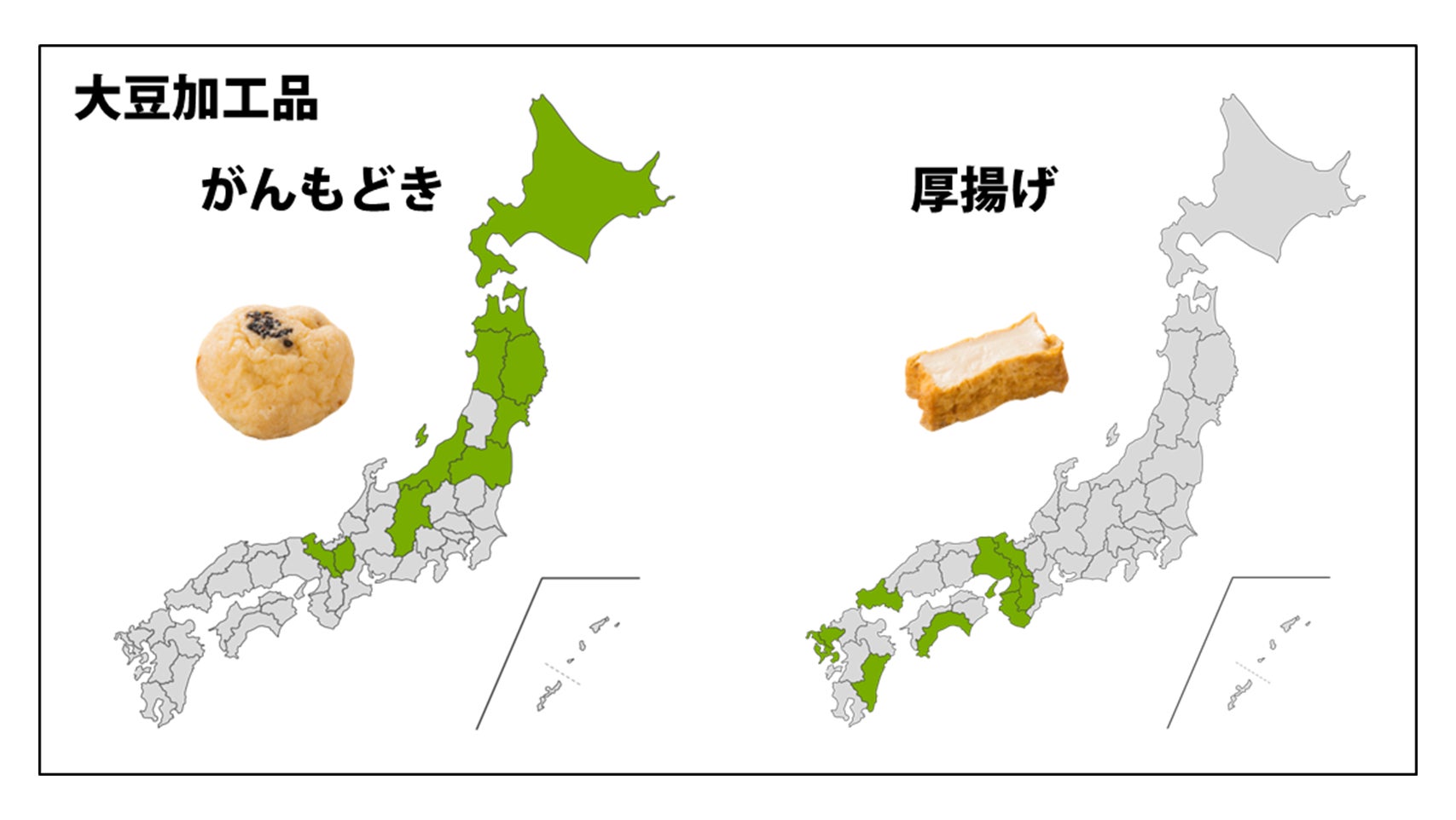 これに対し、厚揚げは全国平均が57.3%以上と喫食率が高いおでん種で、19位まですべて西日本で占めます。京都は5位に入り、がんもどきとともに大豆加工品に愛着があることがわかります。