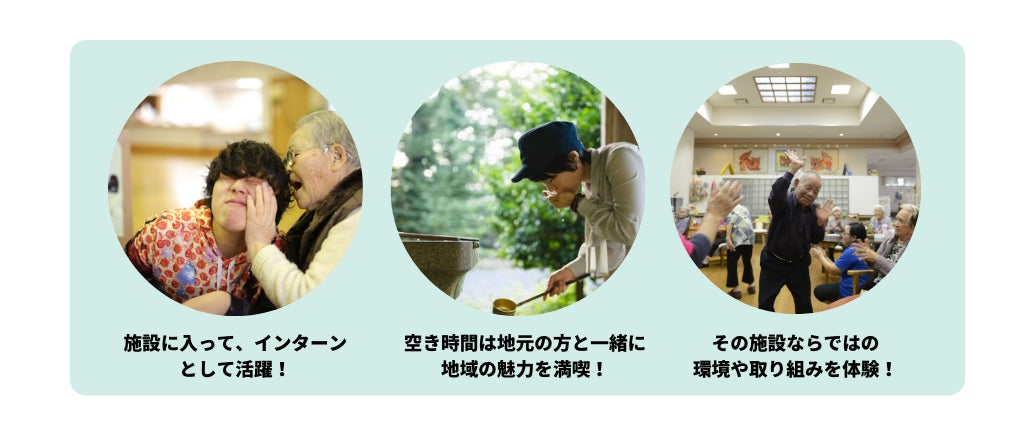 福祉施設の運営に留まらず地域づくりに参画している、未来を見据えた独自のビジョンを掲げている、といった基準を元に、全国各地から「これからの日本の福祉を牽引する」福祉施設を厳選。全国の学校で実施する説明会等を通じて集まる『地域×福祉』に興味関心を持った学生とのマッチングを行い、1週間〜数ヶ月のインターンを実施します。