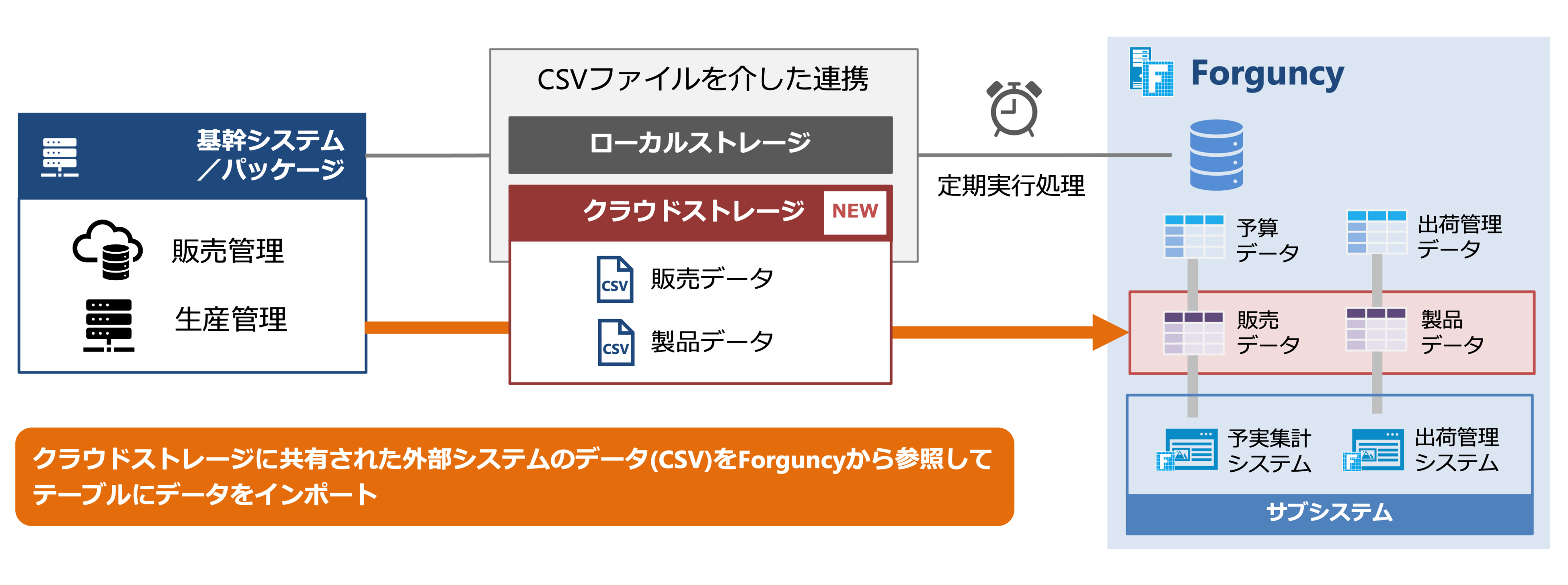 クラウドストレージに共有された基幹システムやクラウドサービスのデータ(CSV)を定期実行処理でForguncyに自動インポートできる。