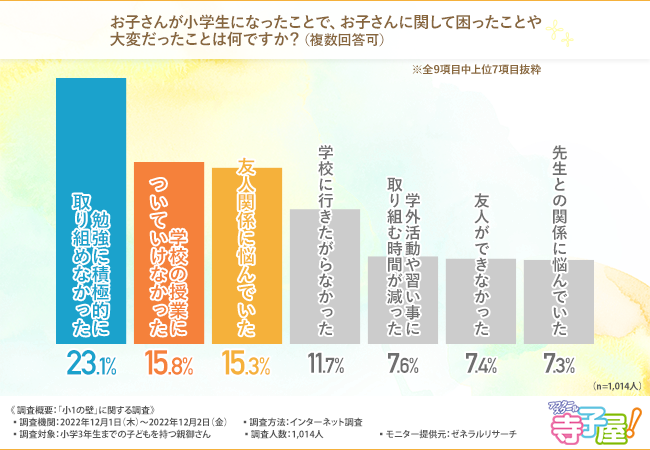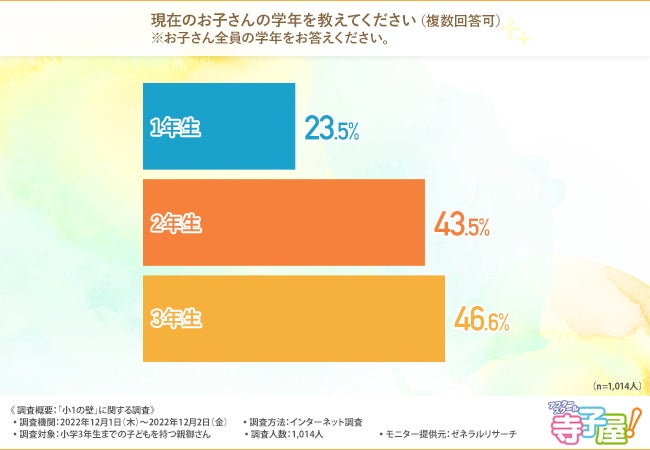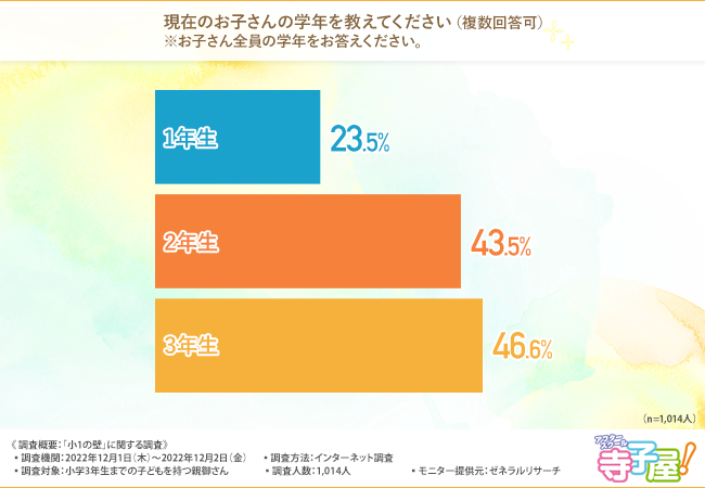 そこで、アフタースクール寺子屋(https://schoolterakoya.tokyo/)は、小学3年生までの子どもを持つ親御さんを対象に「小1の壁」に関する調査を実施しました。