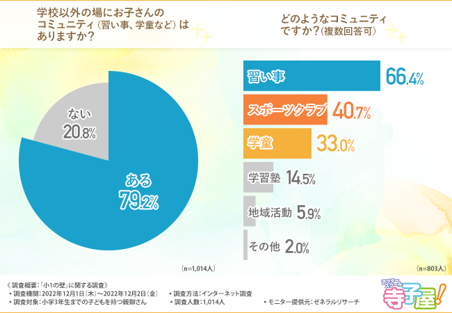- 小学校以外の場に居場所を持つ子どもは8割近くも!学外における子どものコミュニティ、第1位は【習い事】