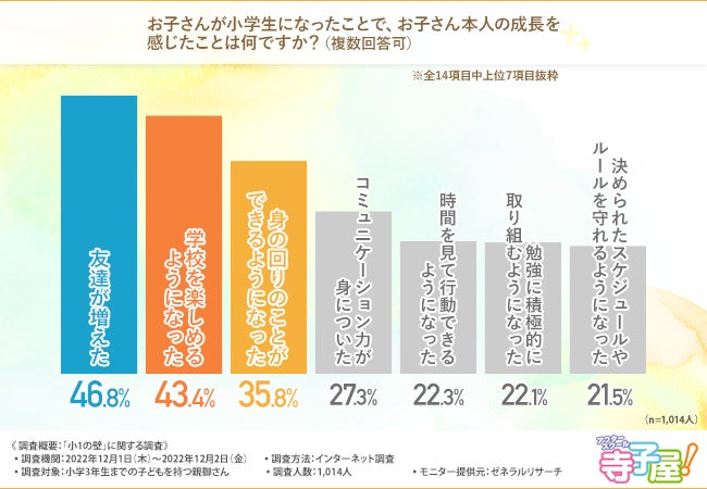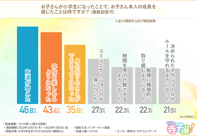 また、お子さんたちは、小学校に入学して急にしっかりするわけではないため、親にとっては安全面、精神面、学習面など心配の種が尽きないものの、「友達が増えた」「身の回りのことができるようになった」など、我が子の社会性の芽生えに成長を感じているようです。