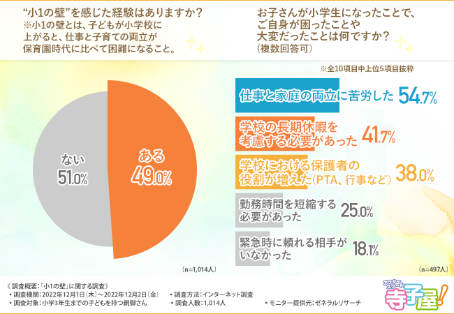 「“小1の壁”を感じた経験はありますか?※小1の壁とは、子どもが小学校に上がると、仕事と子育ての両立が保育園時代に比べて困難になること」と質問したところ、『ある(49.0%)』『ない(51.0%)』という結果となりました。
