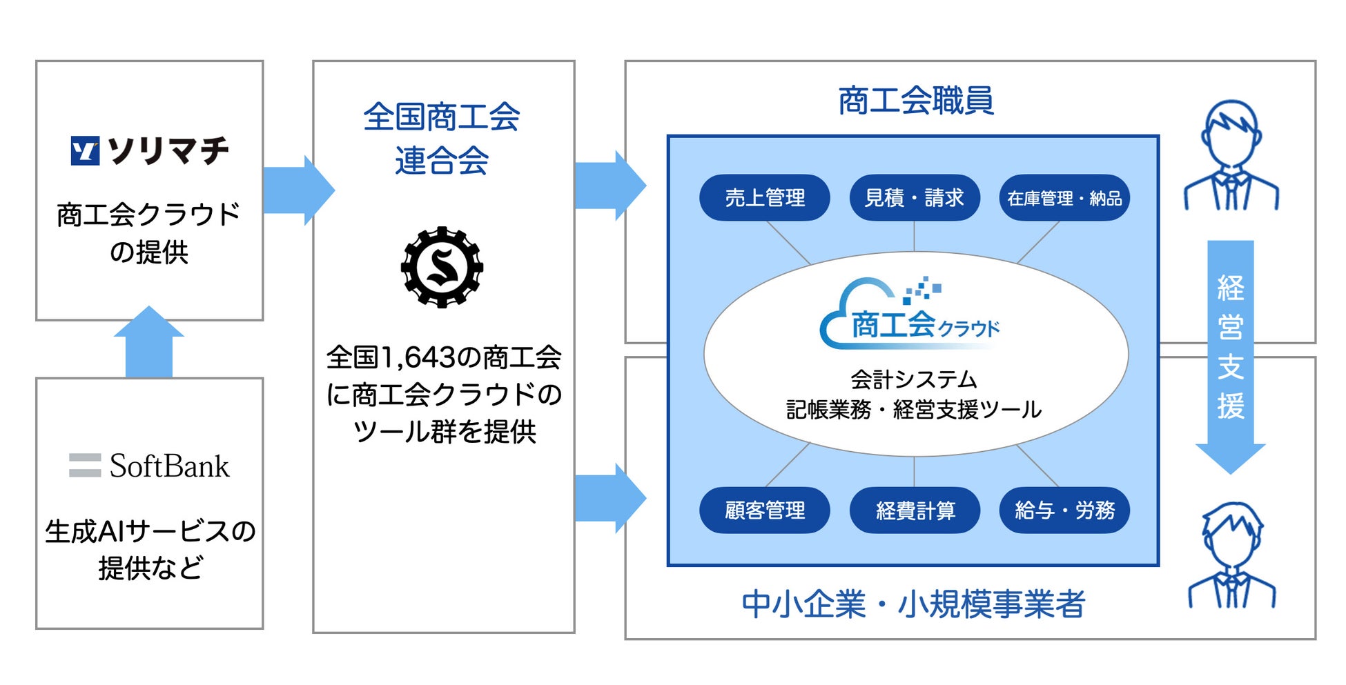両社は、ソリマチが提供する商工会向けのクラウド会計ソフト「商工会クラウド」に生成AI機能を搭載し、これを利用する全国1,643の商工会およびそれに加入する事業者(全国79万会員)の業務効率化を図ります。また、これらの商工会および事業者向けに、ソフトバンクが提供するスマートフォンやタブレットなどの端末、生成AIを中心とした各種ソリューションの販売を行い、DXの推進を支援していきます。