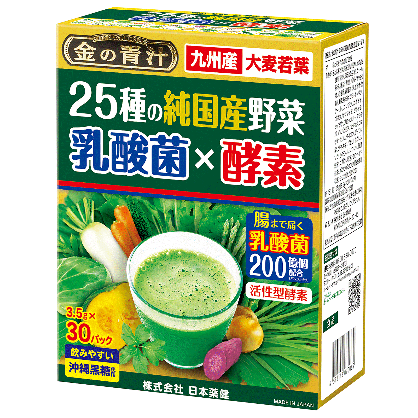 九州産の大麦若葉をはじめ、栄養満点の25種類の純国産野菜がギュっと詰まっています。腸まで届く乳酸菌や青パパイヤ由来の活性型酵素も配合しております。
