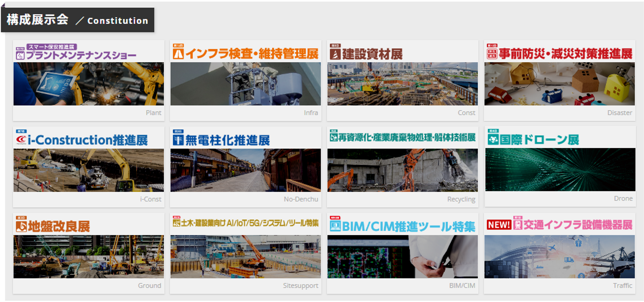 「プラントメンテナンスショー」「インフラ検査・維持管理展」「建設資材展」「事前防災・減災対策推進展」「i-Construction推進展」「無電柱化推進展」「再資源化・産業廃棄物処理・解体技術展」「地盤改良展」「交通インフラ設備機器展」「国際ドローン展」「BIM/CIM推進ツール特集」「土木・建設業向け AI/IoT/5G/システム/ツール特集」