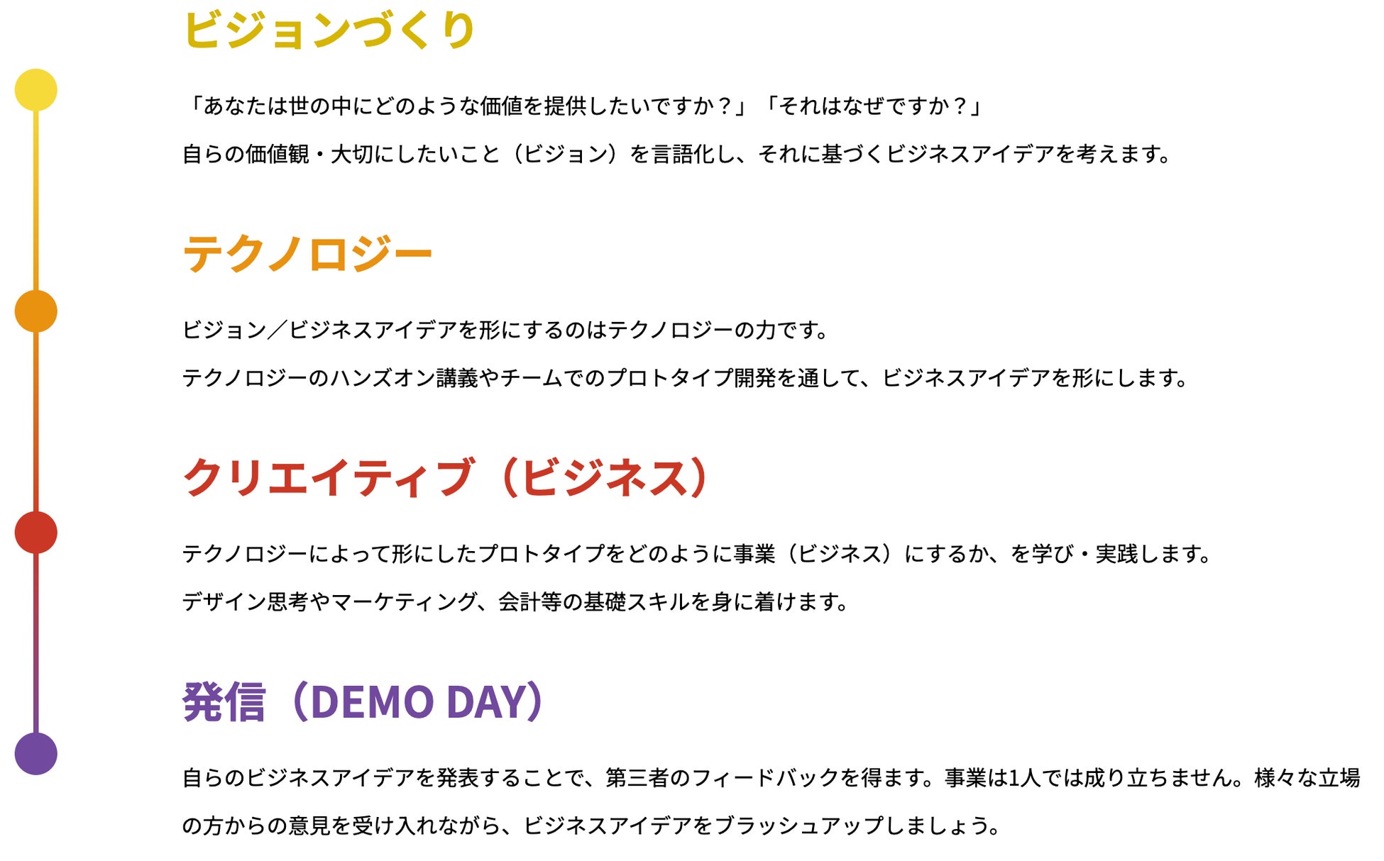 事業創出に必要なマインドセットやスキル(ビジネス・テクノロジー)を一気通貫で学び・実践します。