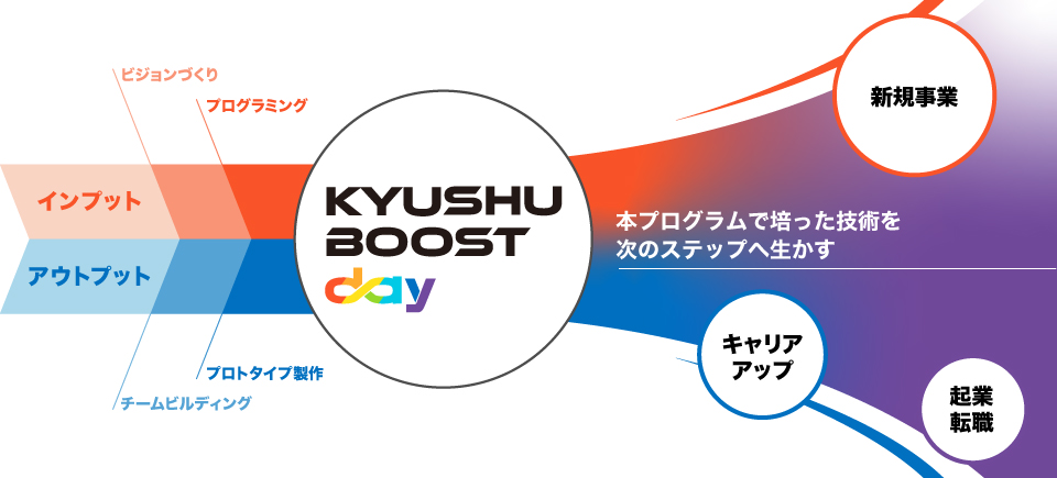 本プログラムではインプット(ハンズオン学習)とアウトプット(チーム活動)を軸に、スキルアップとビジネスアイデアのプロトタイプ開発に挑戦します。参加者の最初の目標はプログラム終盤の「KYUSHU BOOST Day」でのプレゼンテーションです。チーム毎にビジネスアイデアを審査員(投資家等)や一般観覧者の前でプレゼンしていただきます。BOOST Day以降もチーム活動継続、事業化検討を期待しています。