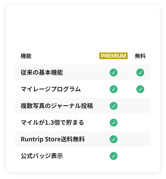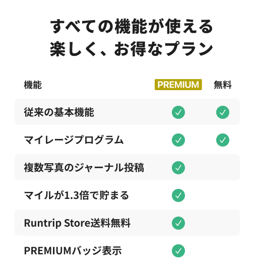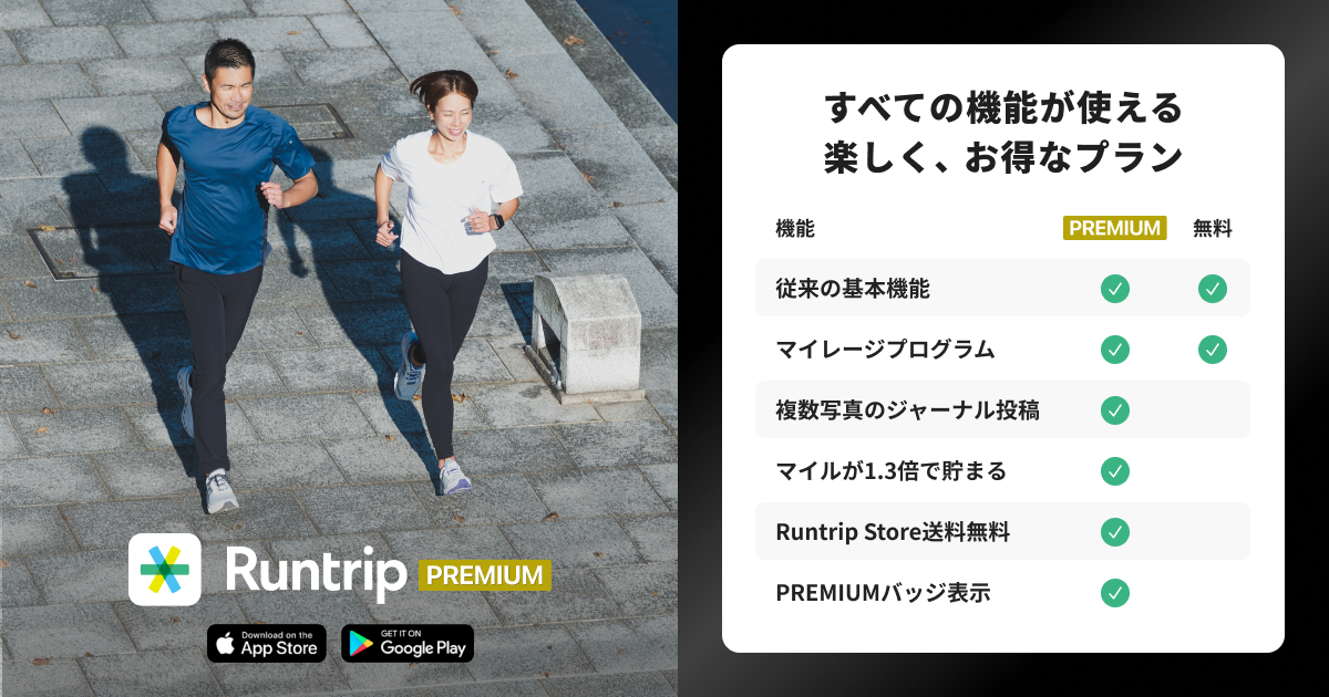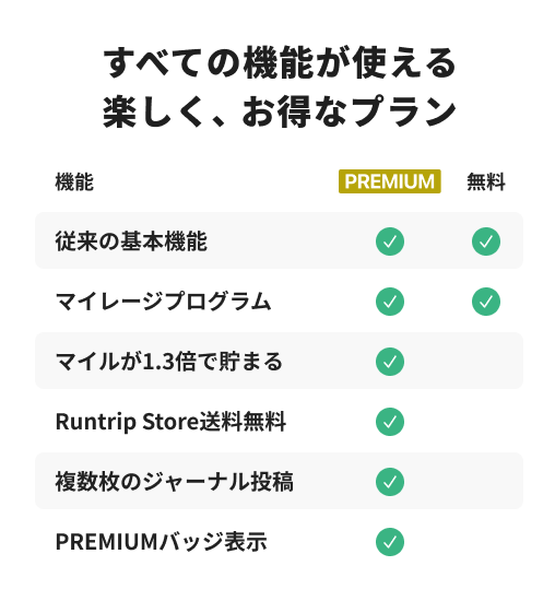 Runtrip PREMIUMメンバーになると、ランニングSNS「ジャーナル」で複数枚の画像投稿が可能になり、「Runtrip マイレージプログラム」において走った距離に応じて貯まるRuntripマイルが通常の1.3倍貯まります。さらにランニングアイテムのECサイト「Runtrip Store」で、送料が常に無料となります。
