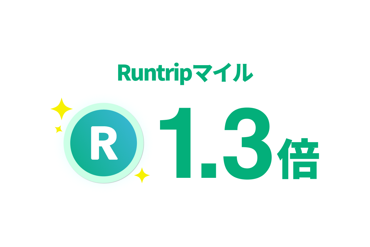 Runtrip マイレージプログラムで貯まる「Runtripマイル」が通常の1.3倍になります。例えばアクティビティ記録による獲得マイルは1日最大50マイル(5km相当)ですが、こちらの最大値が65マイルとなります。