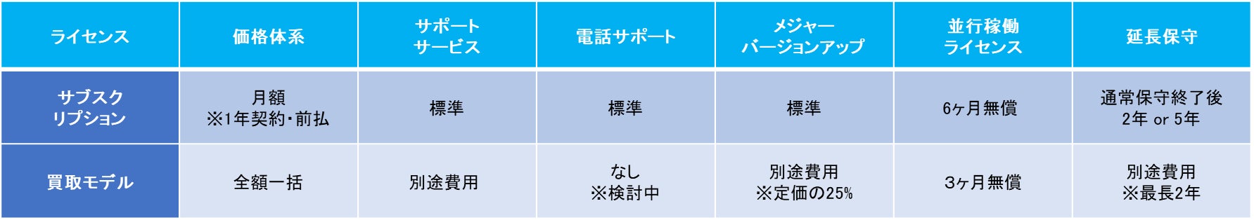 バージョンアップなどの移行時の期間に限って、無料で利用できる並行稼働ライセンスを用意しています。買取モデルは、無償期間が3ヶ月間でしたが、サブスクリプションでは、6ヶ月間に延長しています。