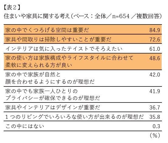 続いて住まいや家具に関する考えをきいたところ、最も多かったのは「家の中でくつろげる空間は重要だ」(84.9%)。さらに「家具や間取りは掃除しやすいことが重要だ」(72.6%)や「家の使い方は家族構成やライフスタイルに合わせて柔軟に変えられる方が良い」(48.6%)が上位にランクインし、短期的・長期的観点から、状況に応じた使いやすさを重要視していることがわかります(表2・色付け部分)。