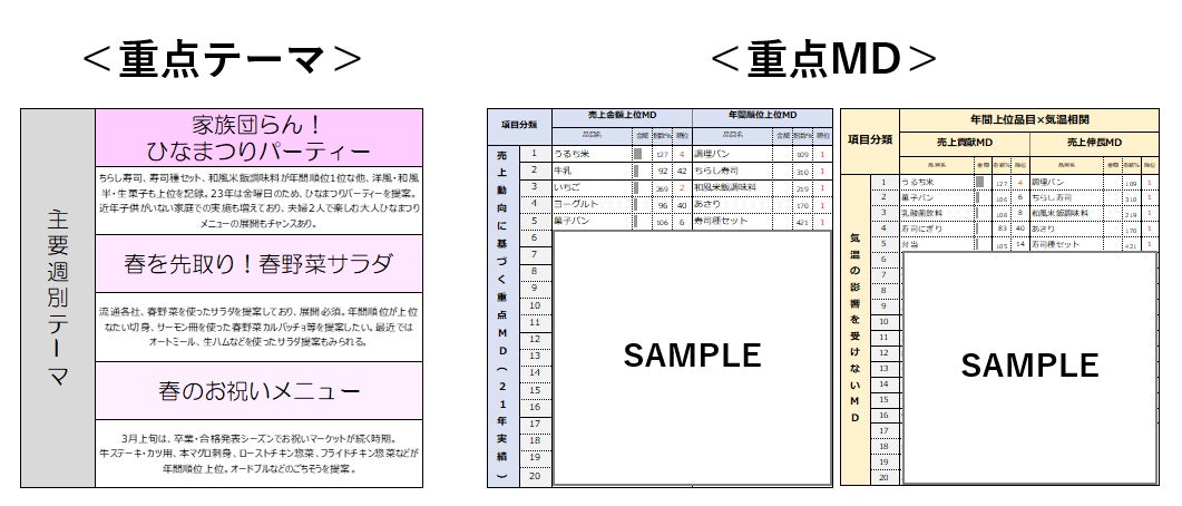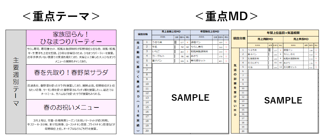 各週の歳時・生活行動、気象傾向、社会行事といった環境与件とPOSデータを分析し、52週毎に重点的に取り組むべきテーマ・MDを掲載しています。客観的データに基づいた重点テーマ・MDにより、月や週・日々の販売効率をより高めることができます。