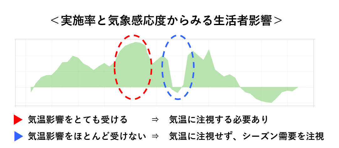 日本気象協会の協力のもと、クレオの自主調査「季節行動調査」と気象データの解析を行い、その週が例年よりも暑く・寒くなった際の、季節行動への影響度合いの把握が可能となりました。これにより、気温の変化にどの程度注視する必要があるのかを明らかにし、急な気温変化や今後の気温予測に対する発注・売場管理に貢献いたします。