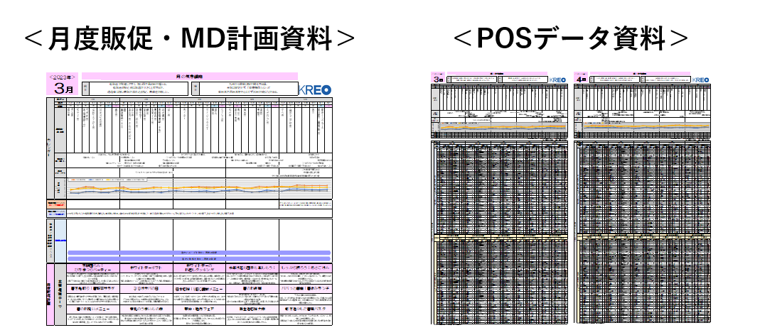 気象MDカレンダーでは、月度販促・MD計画資料とPOSデータ資料の二部構成にてご提供いたします。月度販促・MD計画資料は、一般的な月度計画資料のフォーマットに落とし込んでおり、月度計画資料のテンプレートとしてご活用頂けます。POSデータ資料では、52週ごとに支出金額・金額指数・年間順位の上位MDを掲載しており、自社の取りこぼし・強み商材の把握及び52週MD戦略の策定にご活用頂けます。