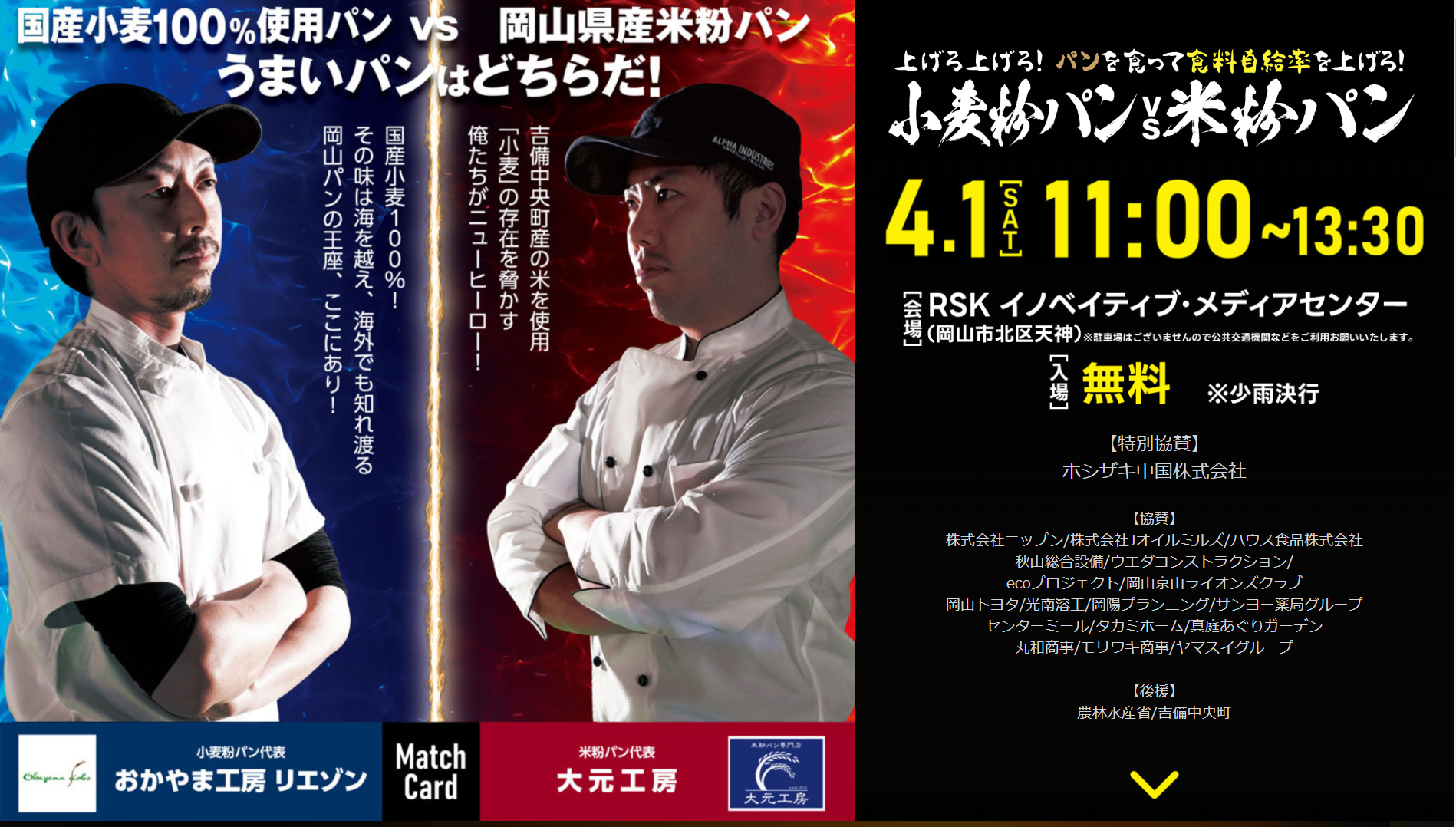 株式会社おかやま工房(本社:岡山県岡山市北区田中112-103 代表取締役:河上 祐隆)は、2023年4月1日(土)、RSK山陽放送が主催するイベントに出演し、国産素材を使ったパン対決のイベントを通じて食料自給率の向上や地産地消の大切さの啓発につとめました。