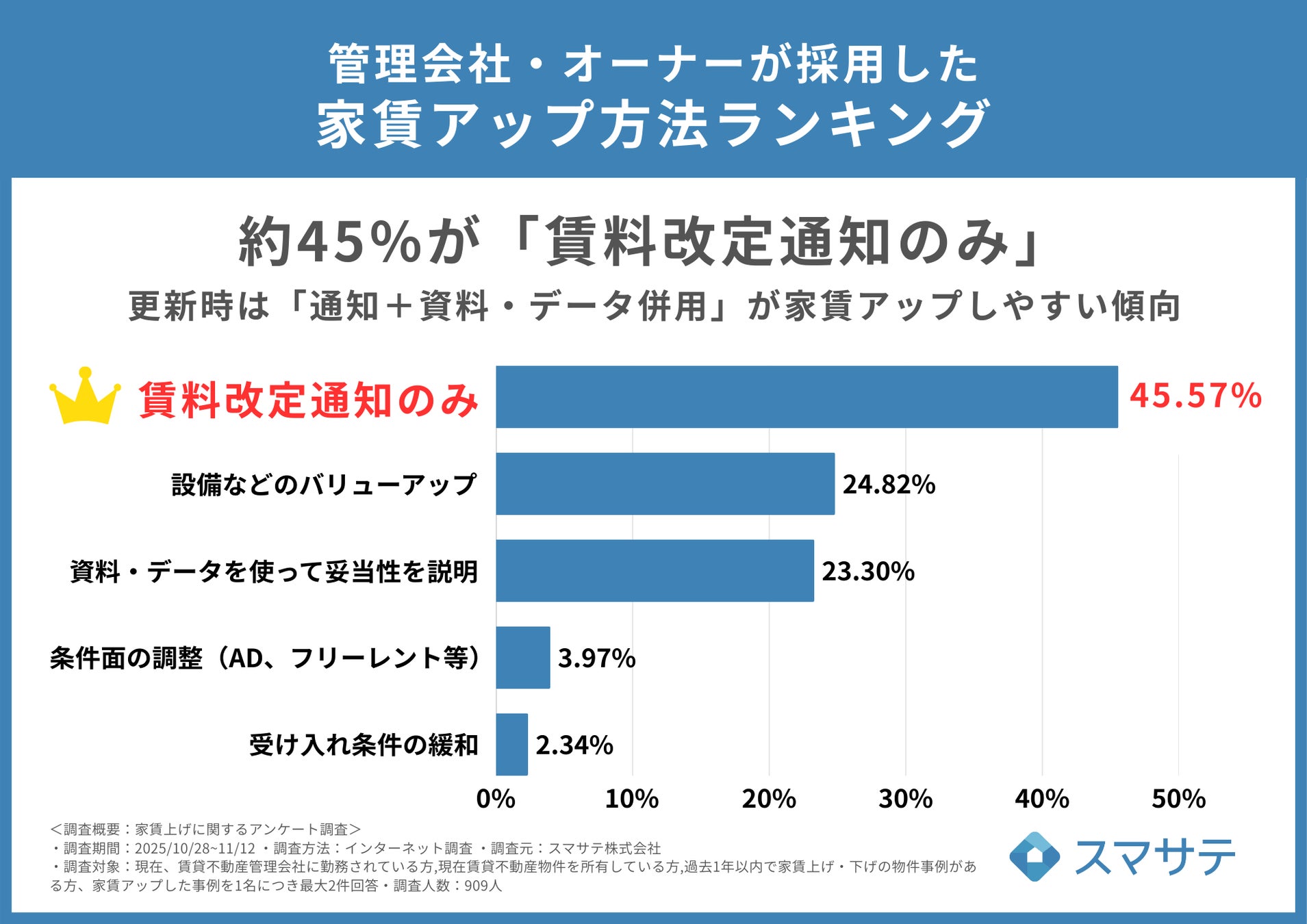 約45%が「賃料改定通知のみ」で家賃アップを実施