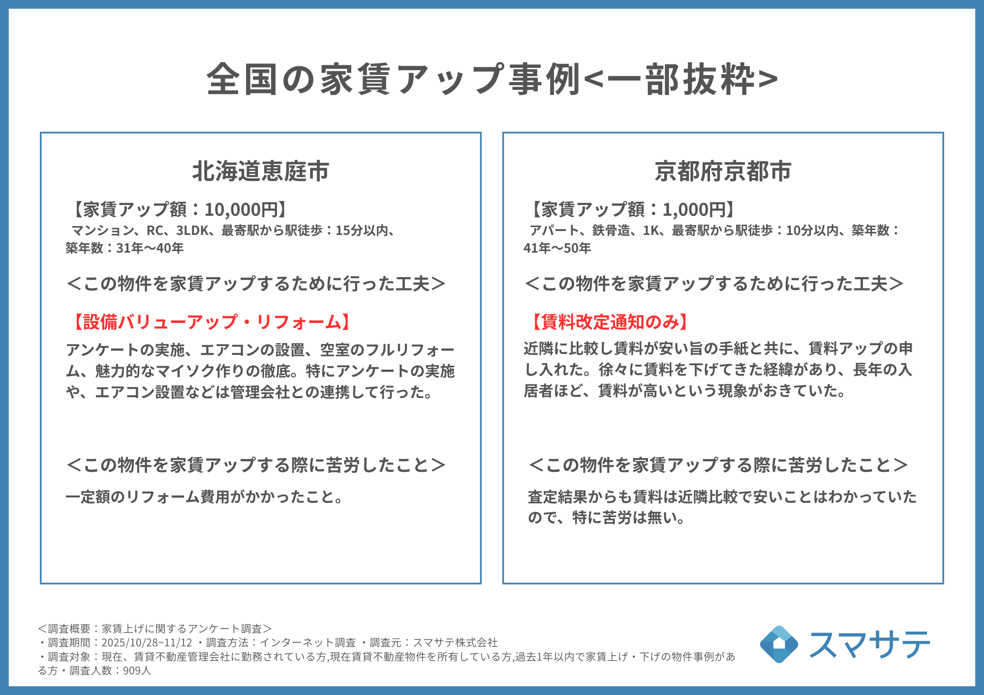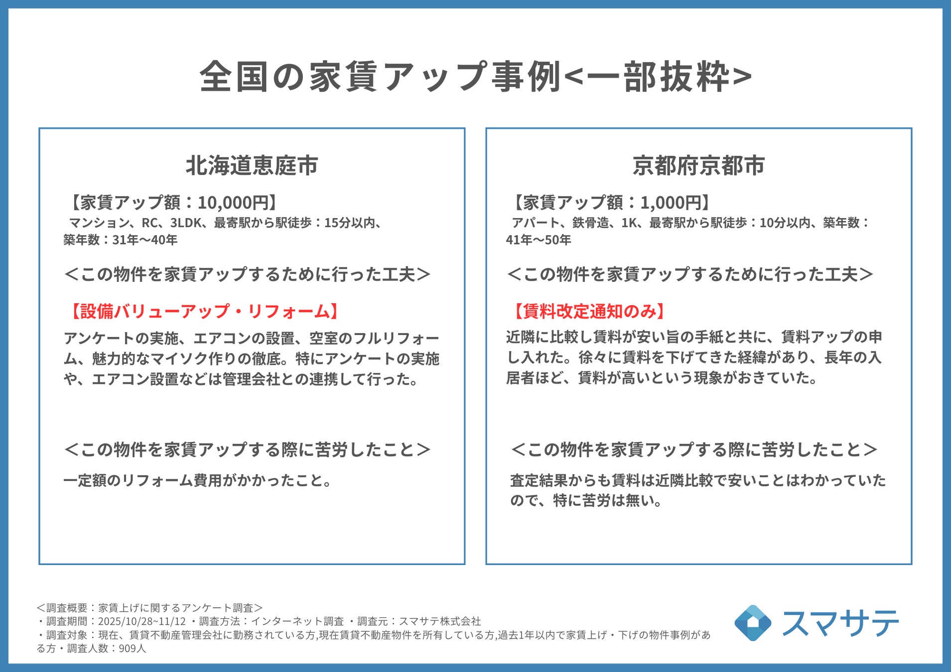 また管理会社・オーナー回答の実際に行った家賃アップ事例も全国エリア別に60件以上公開しています。