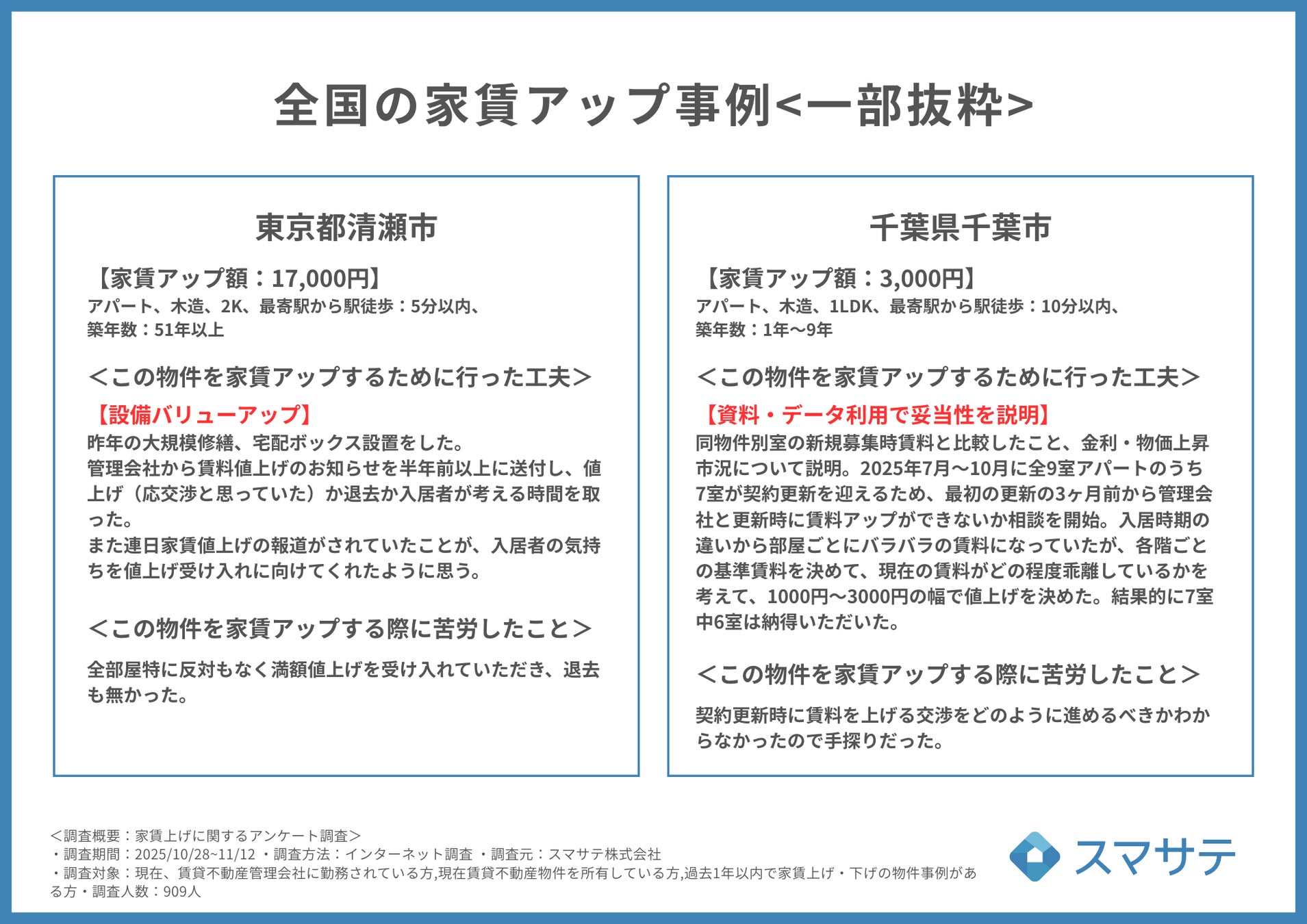2025年10月28日~11月12日に対象となる賃貸管理会社及び賃貸不動産オーナー909名へ家賃アップに関するアンケートを実施、その結果をもとに全国の家賃改定の傾向、実際に採用した家賃アップの方法ランキング、家賃アップに成功した取り組み事例などをまとめた資料の無料配布を開始しました。