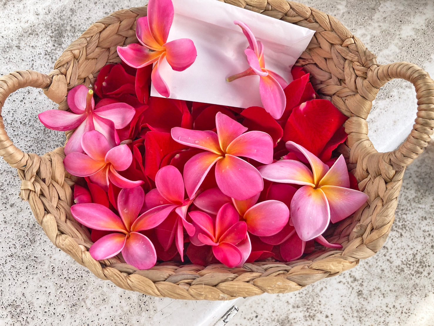 献花に使用する花は、日本国内であってもバラなどの花束に使うような華やかな花を使用しているが、ハワイでは南国ならではのプルメリアなどを使い、色とりどりの献花とともに故人を見送っていく。