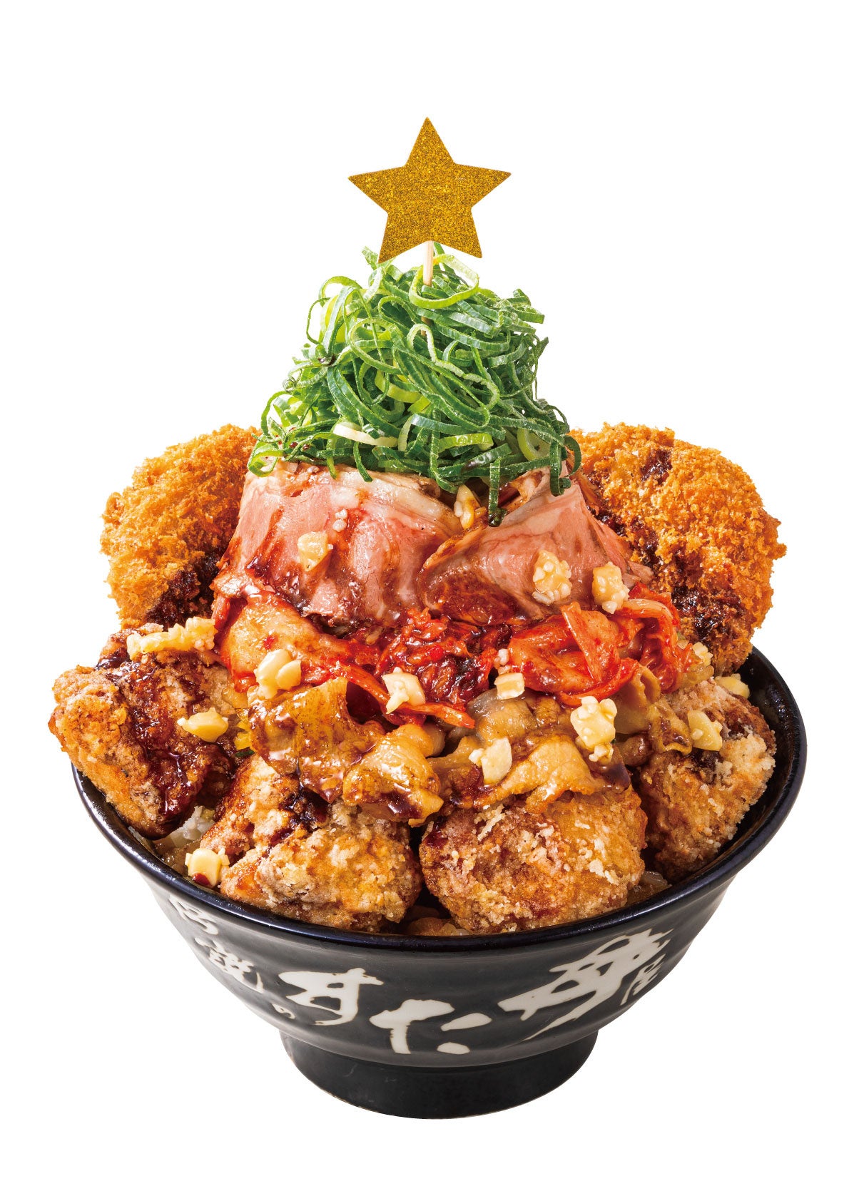 年々形やボリュームを変え新化してきたツリーすた丼、今年は期間限定商品として販売した「牛バラローストビーフ」、初登場となるニンニクのパンチがやみつきになる「すたみなメンチカツ」を加え、牛・豚・鶏3種類の肉が味わえる『豪快!オールスターツリーすた丼』を開発いたしました。