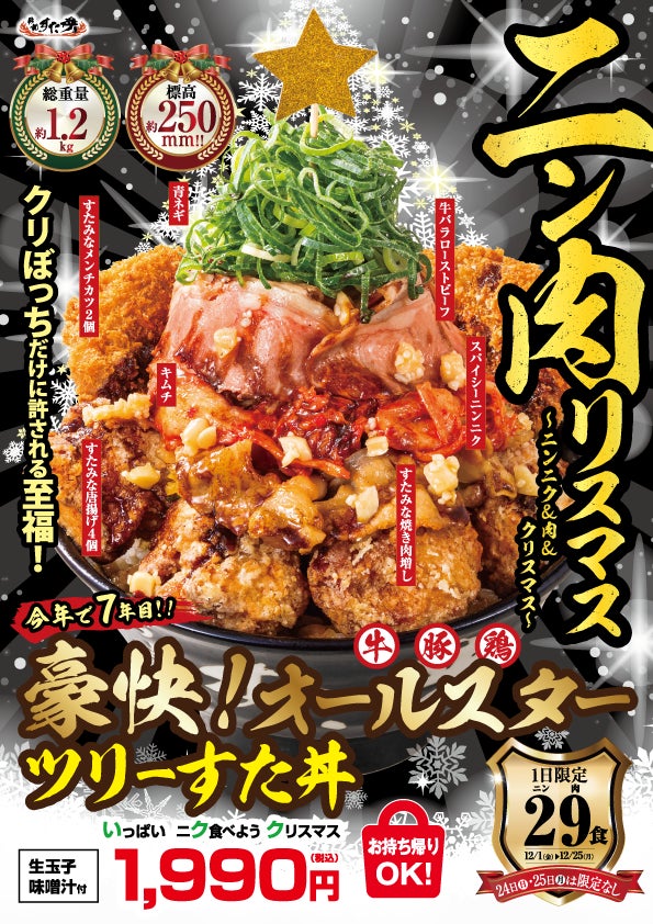 『豪快!オールスターツリーすた丼』は、茶碗約3杯分の大盛りご飯に、並盛の約1.5倍の「すたみな焼き」、雪に見立てた大量の「スパイシーニンニク」、一口では食べきれないほどの大きさを誇る人気商品「すたみな唐揚げ」を4個、脂ののった「牛バラローストビーフ」、ニンニクのパンチがやみつきになる「すたみなメンチカツ」2枚を盛り付け、仕上げにクリスマスカラーの「キムチ(赤)」と「青ねぎ(緑)」をトッピングし、黒ニンニクの熟成された旨みが特徴の「黒すた丼のタレ」をかけ、トップに星を飾り付けクリスマスツリーのイメージを再現した、7年目にふさわしく7種類の具材をトッピングした総重量約1.2kg・標高約250mmのボリューム満点すぎる丼ぶりです。