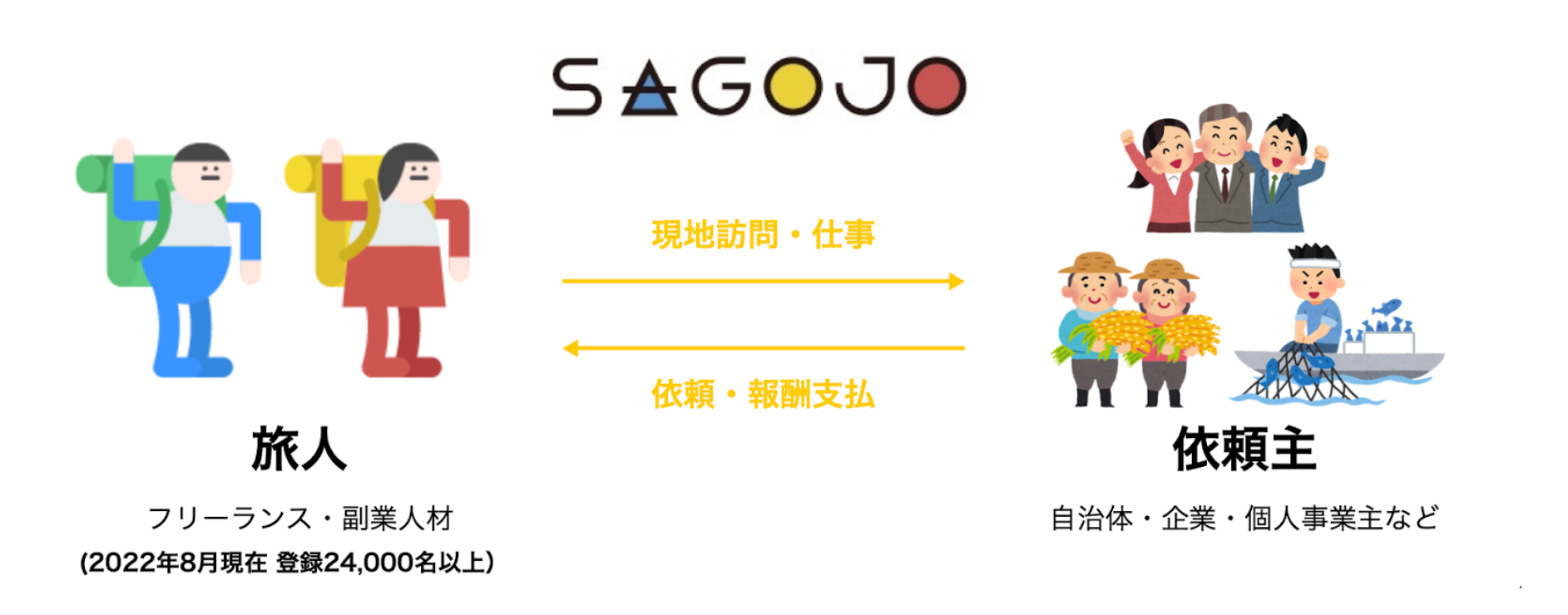 SAGOJO社は、「旅 × シゴト」をコンセプトに、観光促進や移住/関係人口の創出を目指す地域(地方自治体や企業など)と、地域貢献に関心の高い “旅人” をマッチングする人材プラットフォーム『SAGOJO(サゴジョー)』を運営する企業です。 “旅人” とは、旅や移住/多拠点居住に関心が高く、地域貢献に意欲を持つ登録ユーザーのことで、22年8月末現在、約24,000人以上が登録しています。