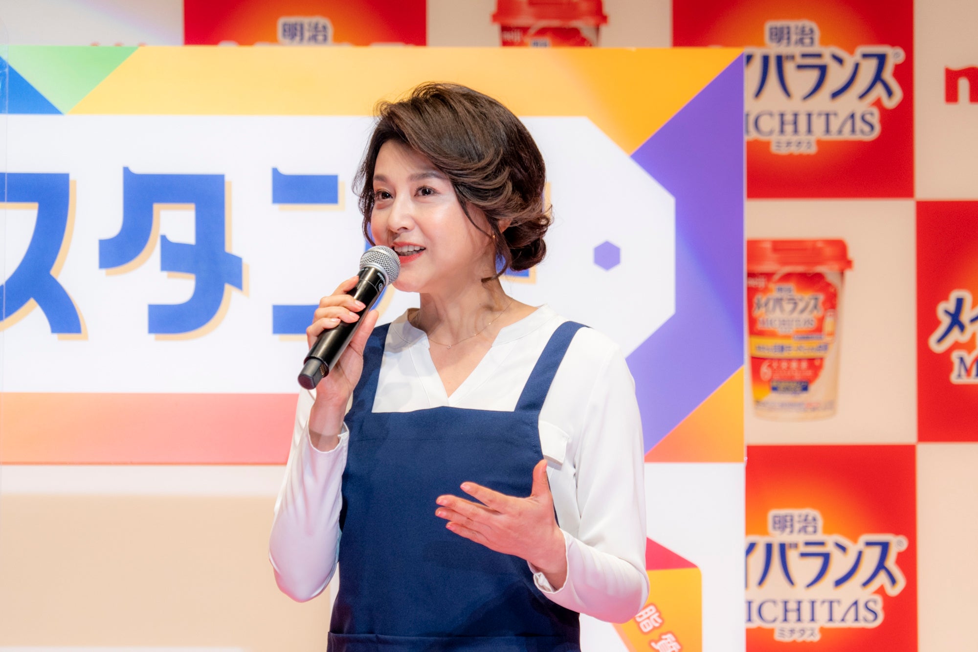 本イベントは医療現場No.1の栄養食ブランド『明治メイバランス』より、人生100年時代を「いつも健康でいたい」という思いに応える新ブランド『明治メイバランスMICHITAS(ミチタス)』の立ち上げを記念し実施いたしました。イベントにはどの年代になっても健康的で輝いている藤原紀香さんと、なかやまきんに君さんにご登壇いただきました。ジューススタンド風のセットの中にエプロン姿で登場したお二人に、カラダの健康のために取り入れていることについて聞くと、藤原さんは「コロナ禍に温活指導士という資格を取りまして。体温を上げて基礎代謝を高め、適度な運動と腸内環境を整えることなど、色んなことを学びました。料理の幅も広がり、最近はよく発酵食品を取り入れています。今度、発酵おせちにもトライしてみようと思っているんです」と、美しさをキープするための努力について明かし、きんに君さんは「睡眠ですね。しっかり睡眠時間を確保して休むことは大事です。寝る子は育つと言いますが、細胞も回復するのでね。でも、お笑いの筋肉はずっと睡眠しています」と自虐を交えながら答えました。さらに、イベントの最後には、きんに君さんの話題のギャグとミチタスをかけ合わせた「ミチタスパワー」を二人で力強く披露し、会場は笑顔と拍手に包まれました。