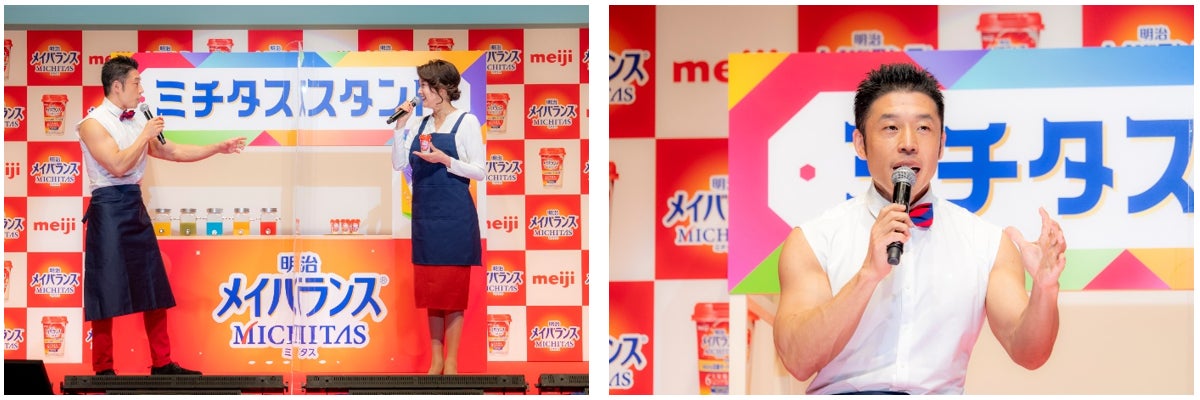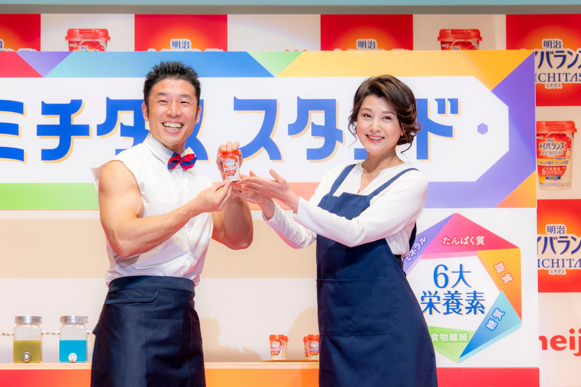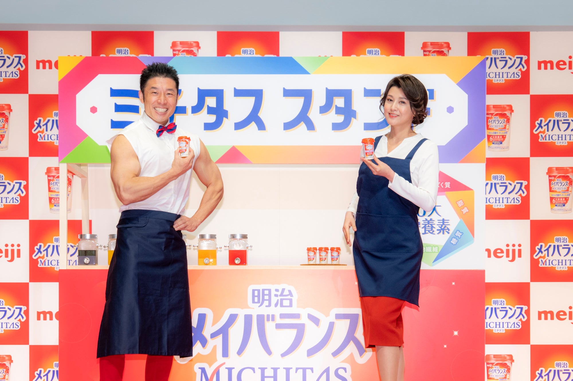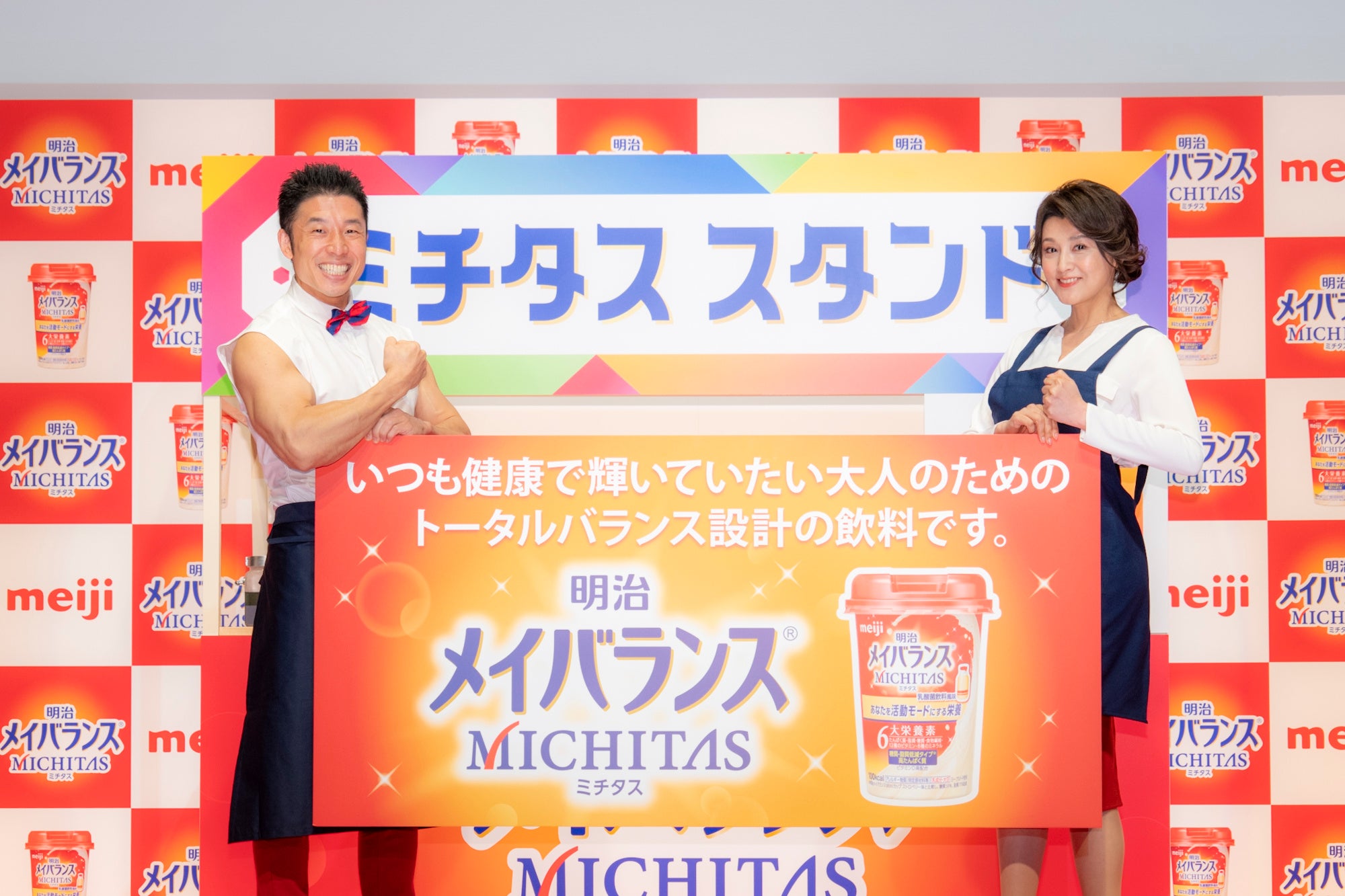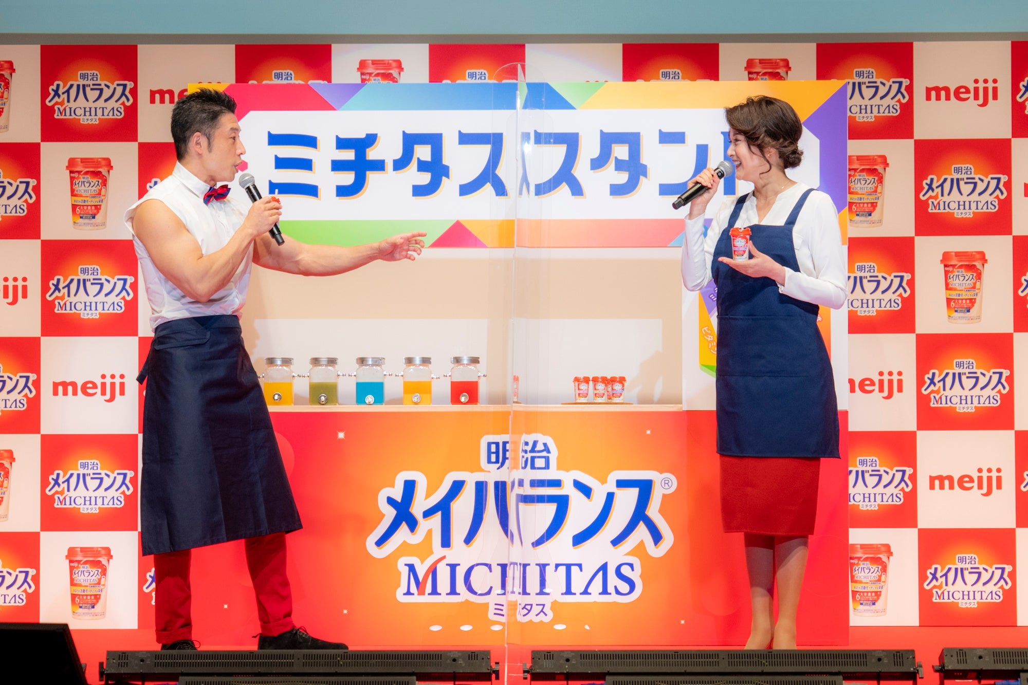「いつまでも健康でいたい」という思いに応える新ブランド『明治メイバランスMICHITAS』持ちネタをかけ合わせた「ミチタスパワー!」披露