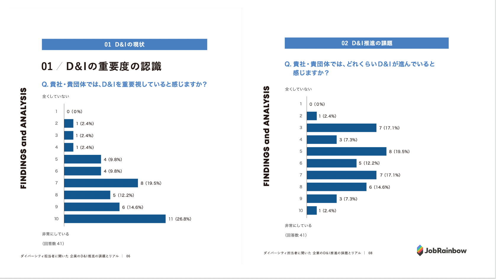 - 回答者の73.1%が自社・団体でD&Iを重視している、と実感。[左グラフ]