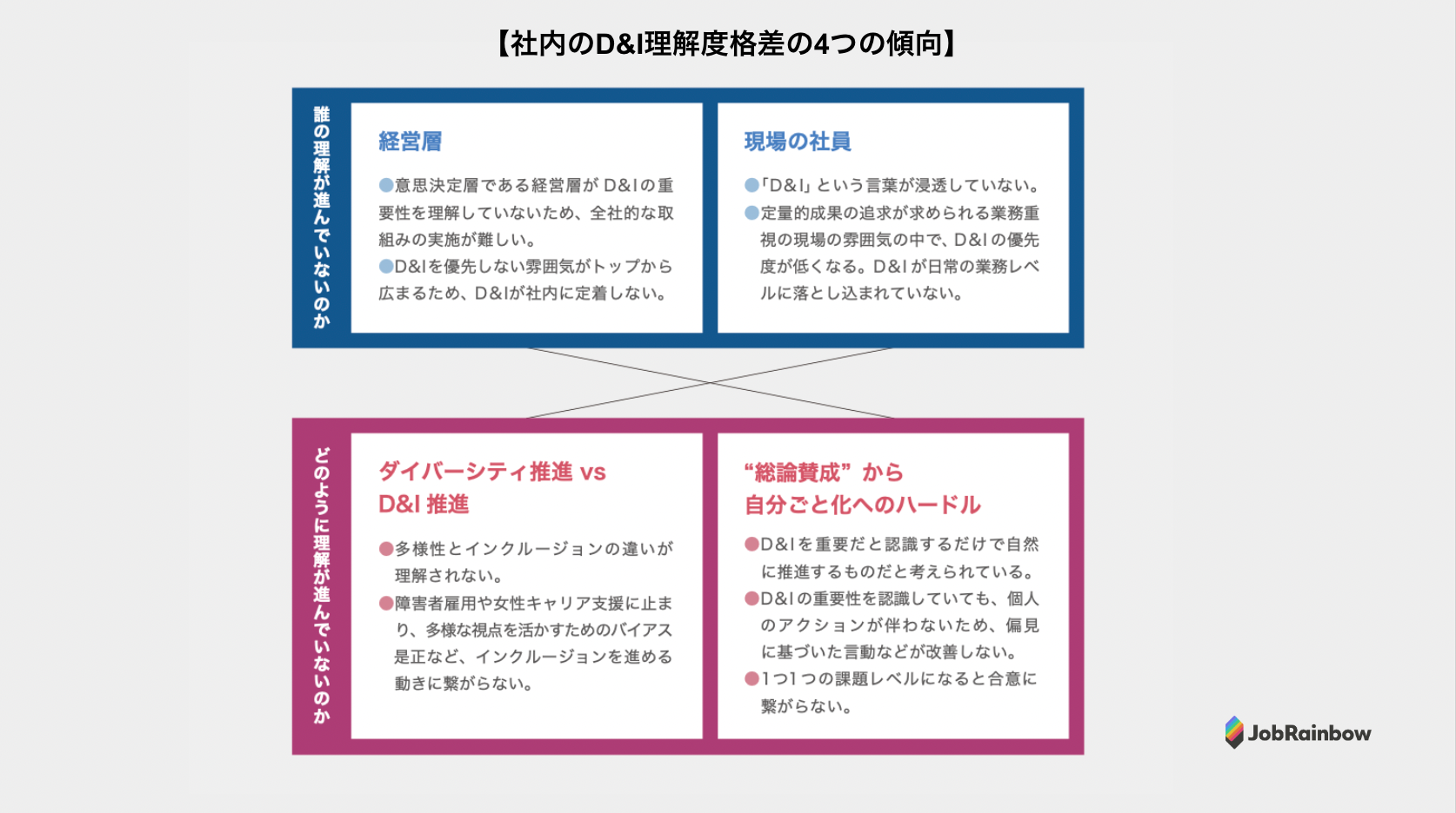 加えて、担当者からは、社内での【D&Iに関する理解度の格差】が、全社的な取組みや個人レベルでの変革アクションを妨げているという声が多数挙げられました。本調査レポートでは、担当者の声をもとに、理解度格差を4つの傾向に分類し独自分析しています。