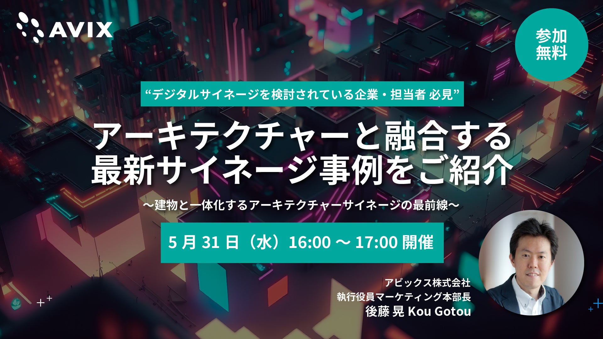 この度、アビックスの執行役員マーケティング本部長の後藤が登壇し、「アーキテクチャーと融合する最新サイネージ事例」について、セミナーを開催いたします。