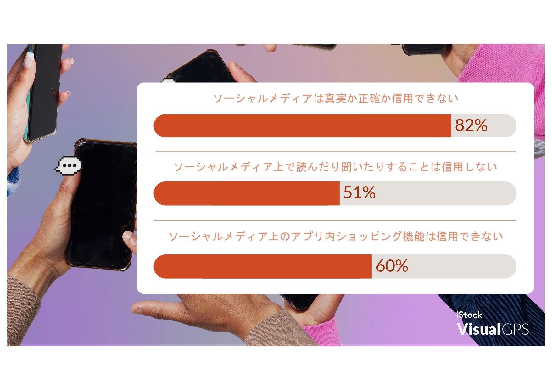 VisualGPSによると、90%近くの人々が、「画像がAIを使用して作成されたかどうかを知りたい」と回答しており、「透明性」を期待していることがわかりました。また、82%がソーシャルメディアのコンテンツに不信感を示しており、ソーシャルメディアにおける信頼ギャップが大きいことも明らかになりました。中小企業にとって、このような不信感は、疑心暗鬼が蔓延する環境の中で、いかにして顧客と本音でつながるかという課題を提示しています。